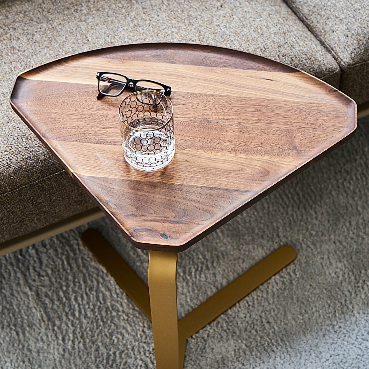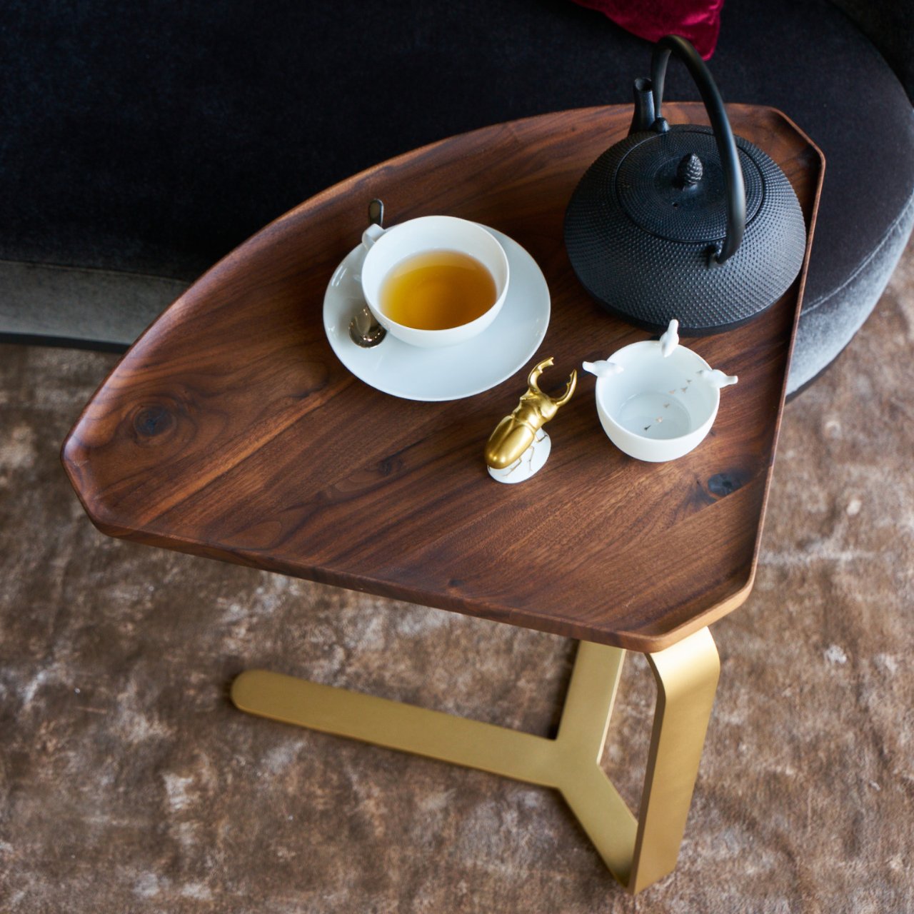 Die Platte des Beistelltisches "Joy" ist Nussbaum geölt, Granit, oder Esche gebeizt oder lackiert erhältlich; und das Gestell in messing matt, kupfer matt oder anthrazit matt.