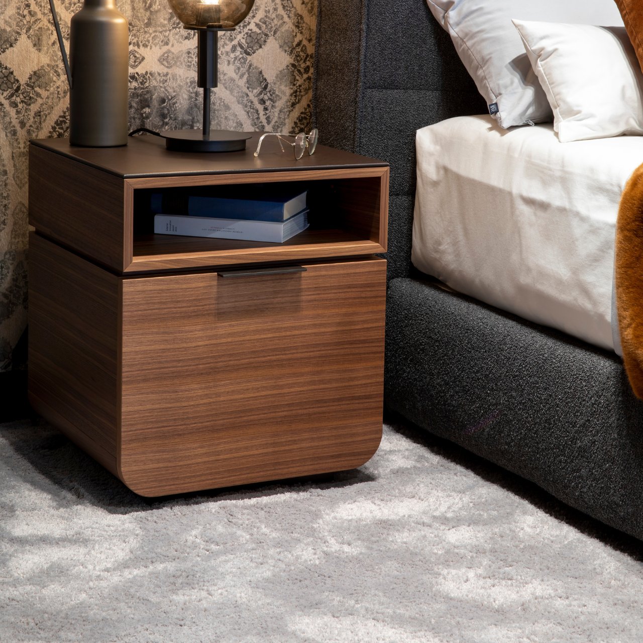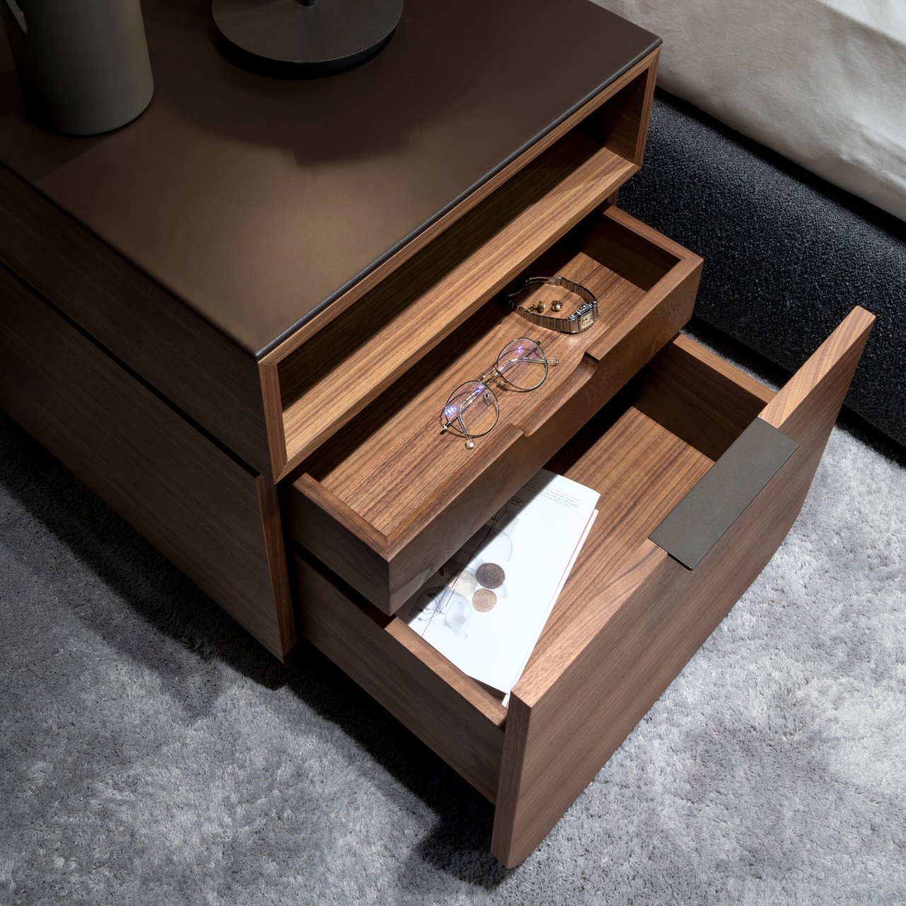 Der Nachttisch "Henry" von BIELEFELDER WERKSTÄTTEN besticht durch seine Klarheit und überzeugt durch seine kompakte Eleganz. Entworfen wurde "Henry" von der italienischen Designerin Claudia Campone. Das Besondere an "Henry" ist die unorthodoxe Form und die Kombination die von einer Kommode mit geheimer Innenschublade, über eine offene Nische bis zu einer in materiellen Kontrast stehenden Tischplatte auf einander aufbaut. Für die bestmögliche Passung in Ihr privates Umfeld, haben Sie die Wahl zwischen "Henry" in RAL 7044 lackiert oder aus hochwertigem amerikanischem Nussbaum.