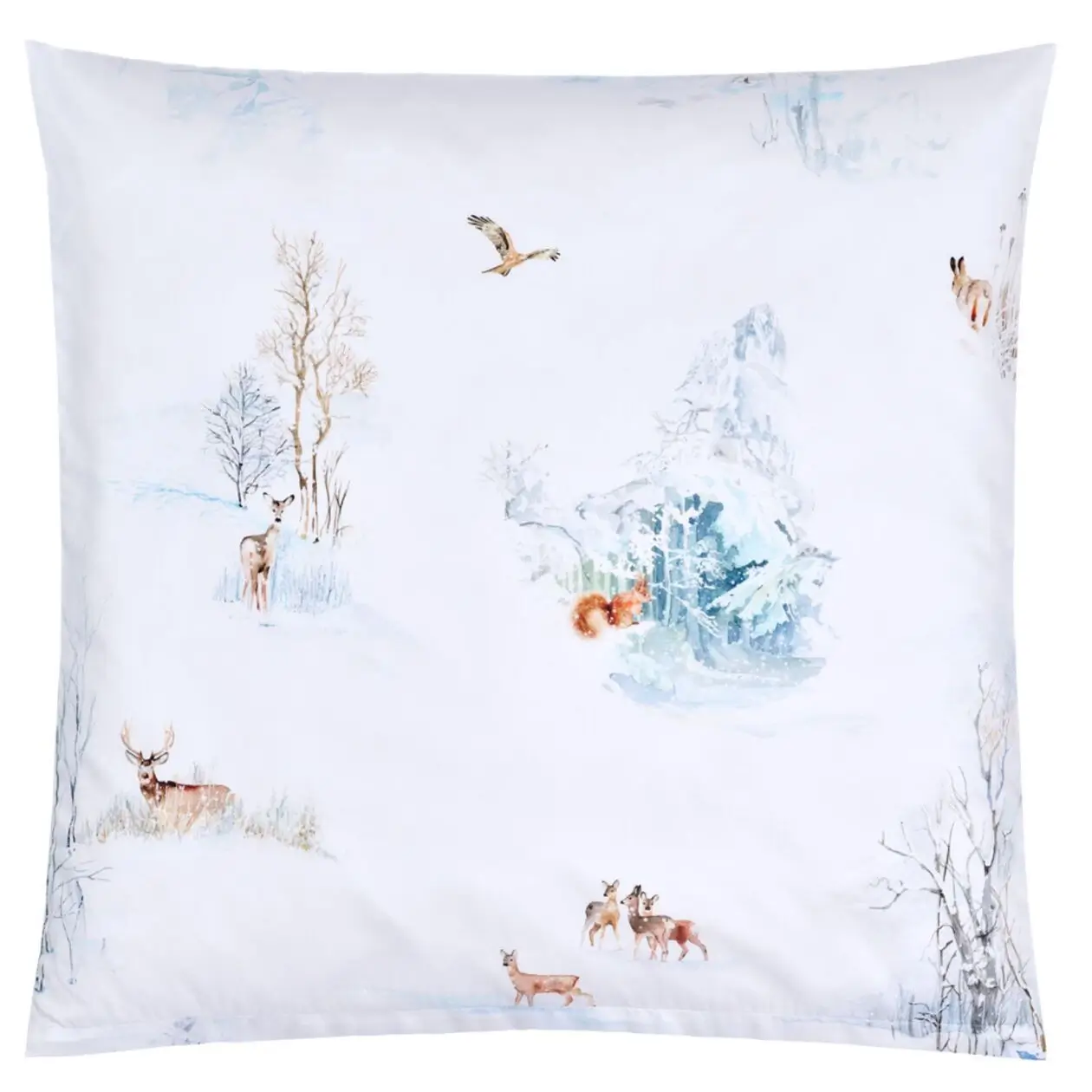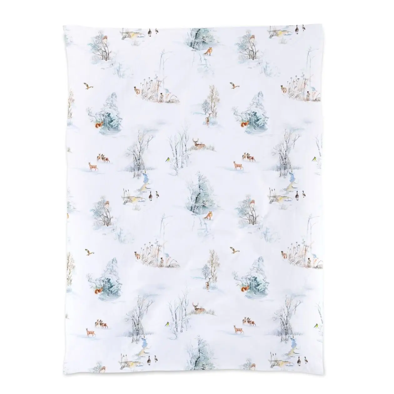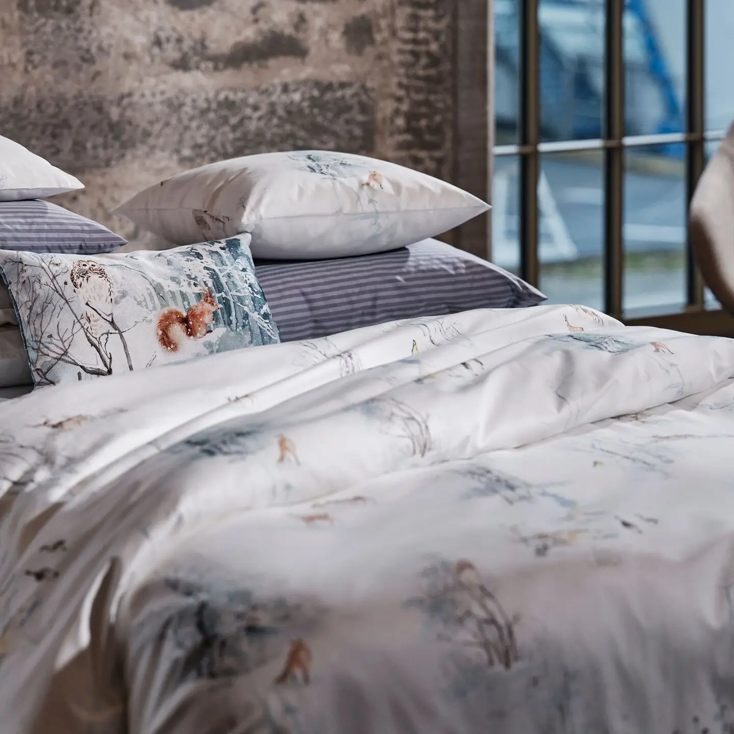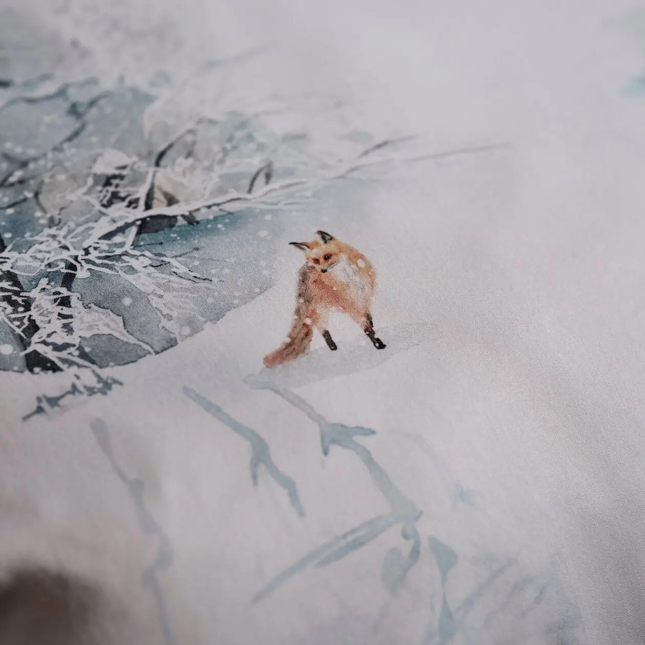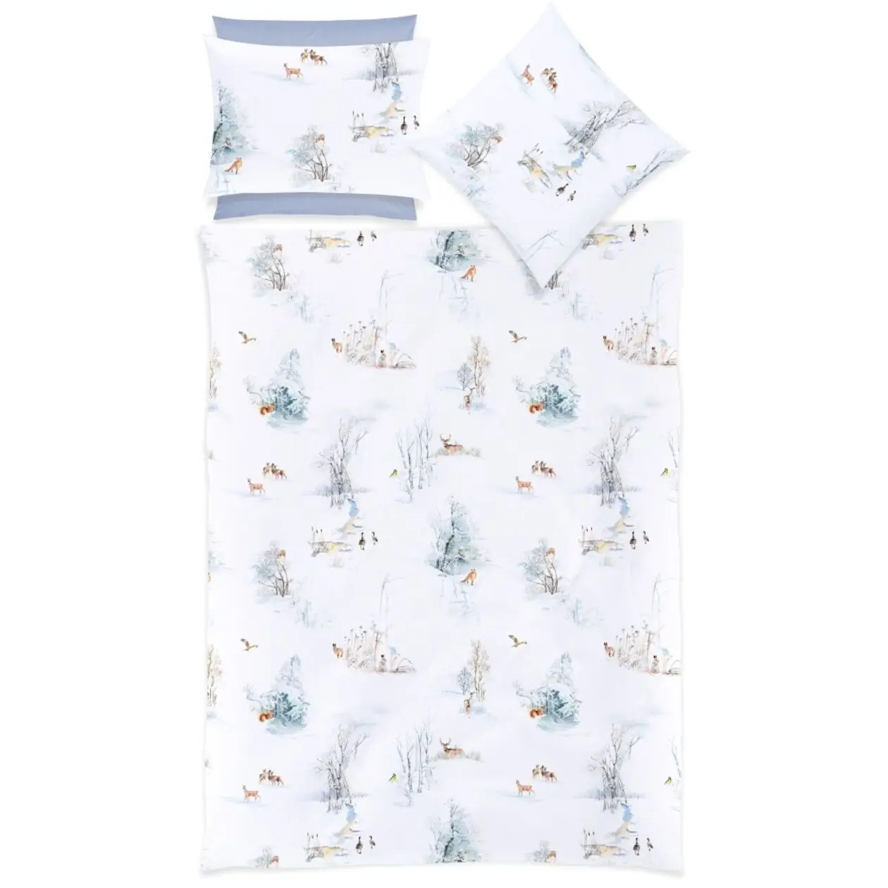 Die Satin-Bettwäsche „Finja“ von Christian Fischbacher bringt die stille Magie des Winters direkt ins Schlafzimmer. Das kunstvoll illustrierte Design mit verträumten Waldtieren wie Rehen, Füchsen, Eichhörnchen und Greifvögeln auf schneeweißem Grund verleiht jedem Raum eine ruhige, natürliche Atmosphäre. Zarte Blau- und Brauntöne unterstreichen die friedliche Stimmung und machen „Finja“ zu einem wahren Blickfang – besonders in der kalten Jahreszeit.