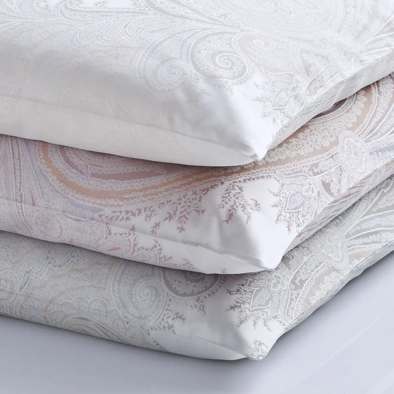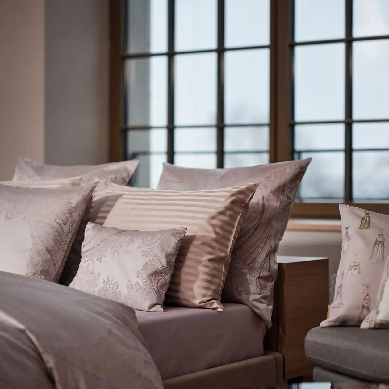 Die Bettwäsche „Grace“ von Christian Fischbacher bringt eine Aura von zeitloser Eleganz in Ihr Schlafzimmer. Das kunstvoll eingewebte Paisley-Motiv in schimmernden Gold-, Silber- und Rosé-Tönen entfaltet auf dem edlen Jacquard-Gewebe eine eindrucksvolle Tiefe und edle Mehrfarbigkeit – ein textiles Kunstwerk, das jede Umgebung stilvoll veredelt.