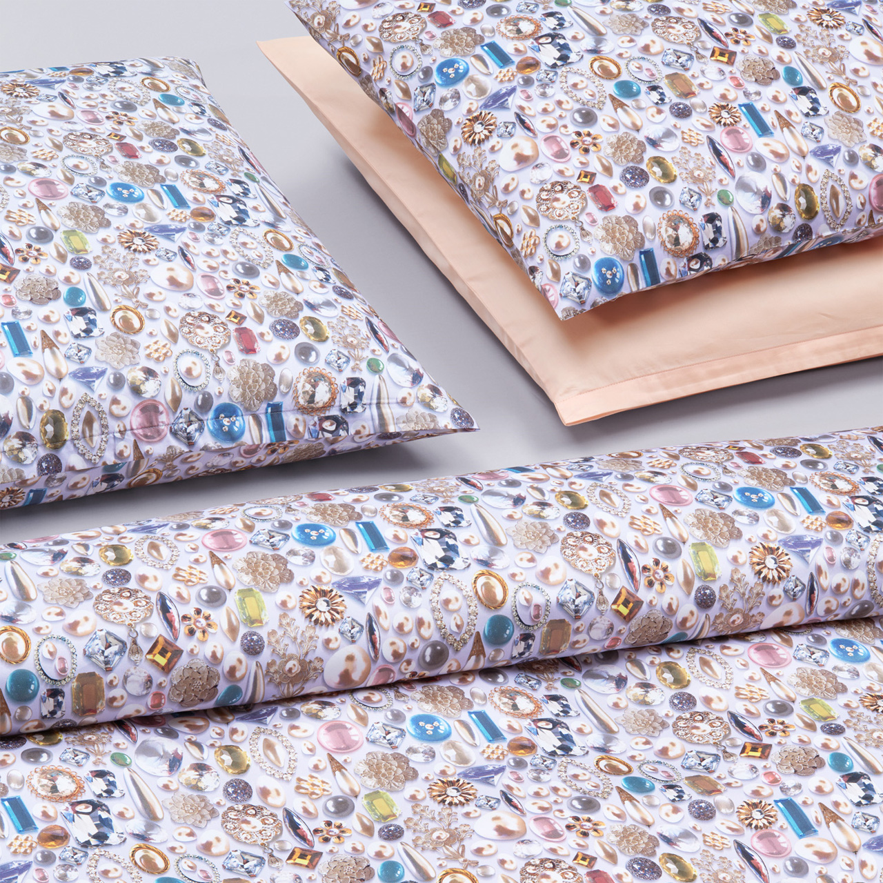 Die Bettwäsche "Tesoro" präsentiert Christian Fischbacher prunkvoll in feinstem Baumwollsatin. Die außergewöhnliche Bettwäsche ist mit Edelsteinen, Diamanten, Gold und Perlen verziert, welche ein Meisterwerk für die Augen darstellen. So entsteht ein erlesenes Design auf zartgrauem Grund, das in dreidimensionaler Optik fast greifbar wirkt.