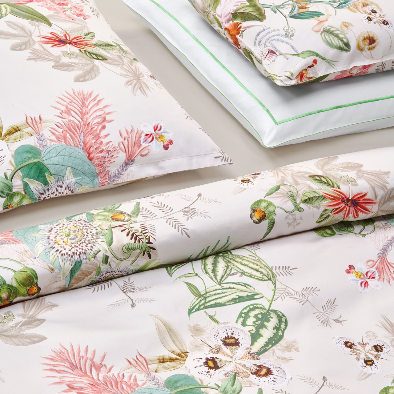 Das bezaubernde botanische Muster der Jacquard Bettwäsche von Christian Fischbacher in zarten Grüntönen und lebendigen Pastellfarben bringt die Schönheit der Natur in Ihr Zuhause. Feine Details und sorgfältig gestaltete Pflanzenmotive verleihen der Bettwäsche eine künstlerische Note. Diese luxuriöse Bettwäsche aus 100 % Baumwolle in Jacquard-Technik bringt die Frische und Lebendigkeit der Natur direkt in Ihr Schlafzimmer.