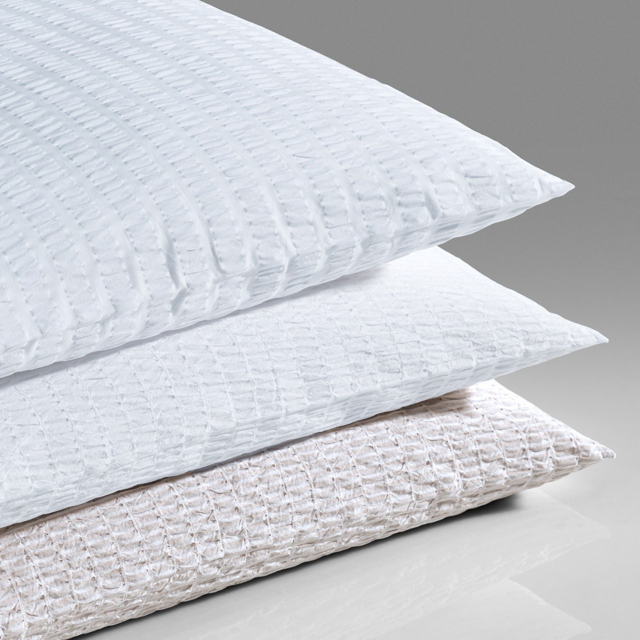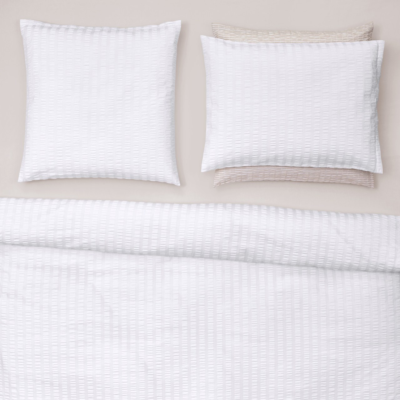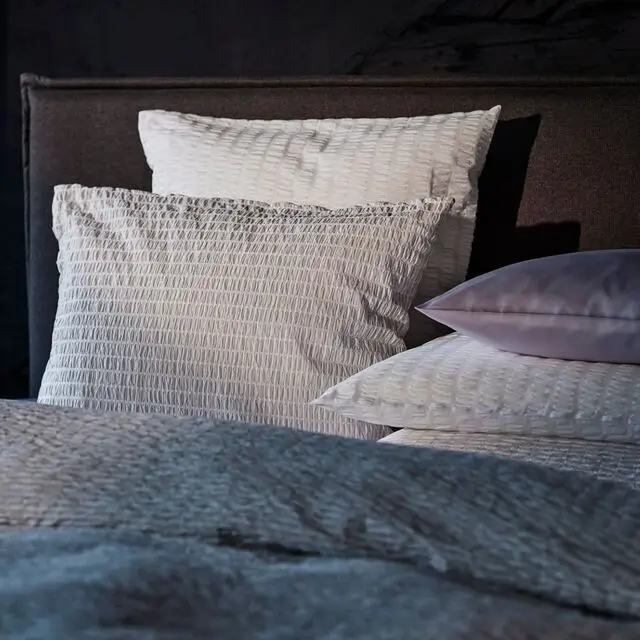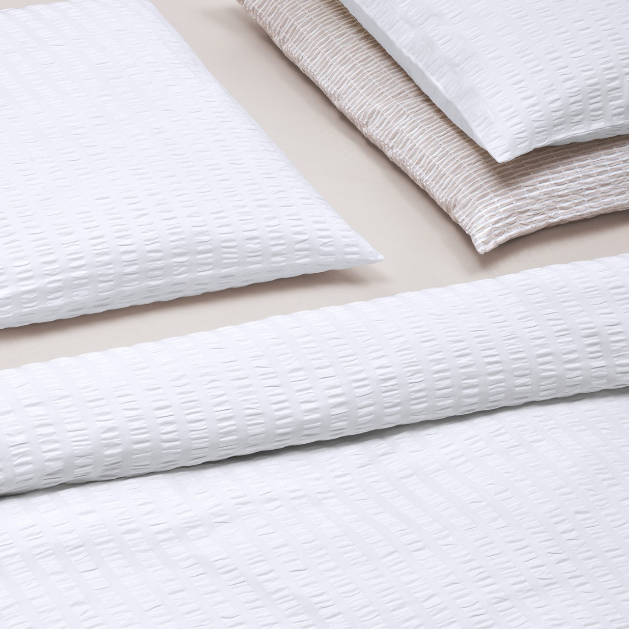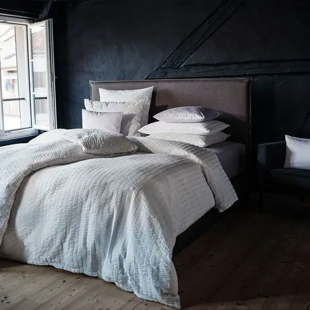Die Seersucker-Bettwäsche "Flow" von Christian Fischbacher besticht durch ihr zeitloses, minimalistisches Design. Die Oberfläche ist mit einem subtilen, wellenartigen Muster versehen, das der typischen Seersucker-Textur entspricht. Diese leicht erhabene Struktur verleiht der Bettwäsche nicht nur eine visuelle Tiefe, sondern auch einen angenehmen Griff. Das dezente weiße Muster ist klassisch und sorgt für eine frische, saubere Ästhetik, die sich nahtlos in verschiedene Schlafzimmerstile einfügt.
