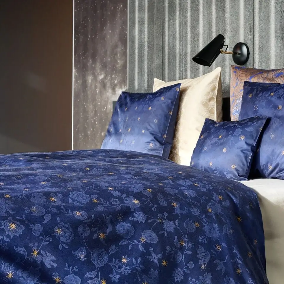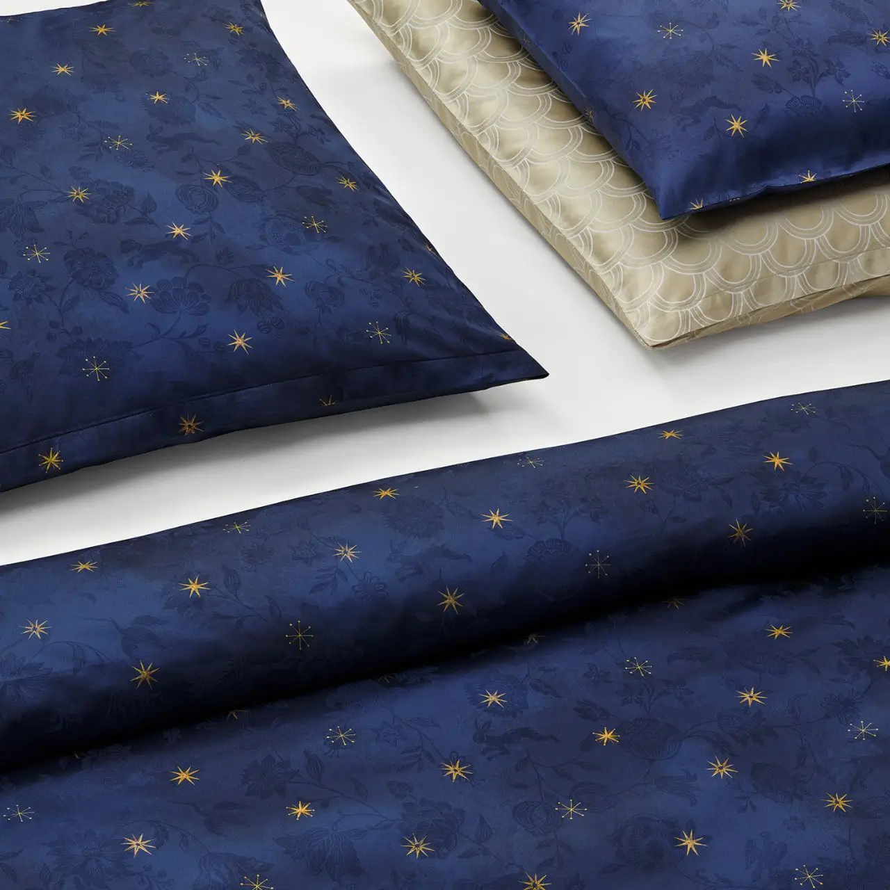 Das Design "Shooting Star" der Jacquard-Bettwäsche von Christian Fischbacher bringt eine faszinierende Aura zeitloser Eleganz in ihren Schlafraum. Auf tief nachtblauem Grund funkeln goldene Sterne wie ein prachtvoller Sternenhimmel und zaubern eine luxuriöse, verträumte Atmosphäre in Ihr Zuhause. Die kunstvolle Kombination aus traditioneller Jacquard-Webtechnik und edlem Druck setzt in jedem Raum ein stilvolles Design-Statement.