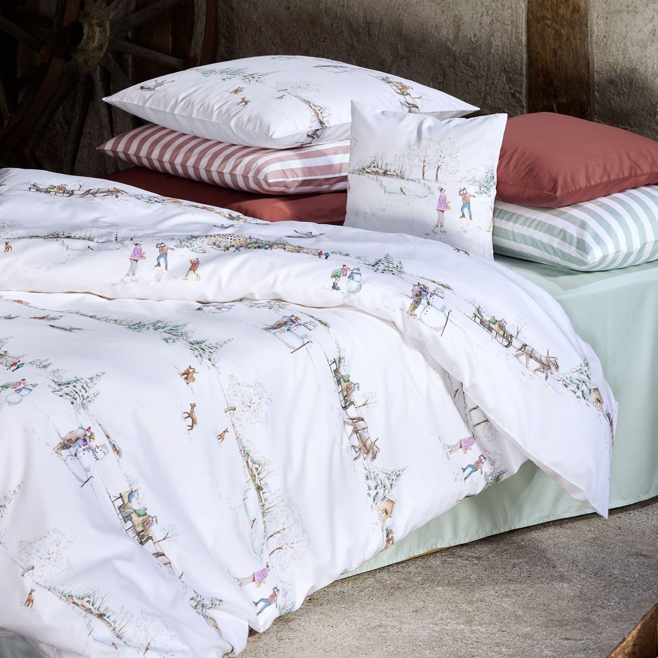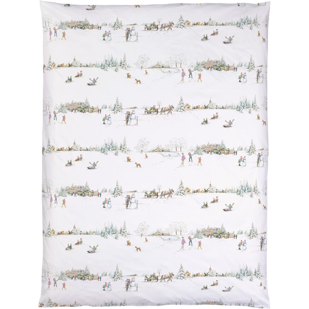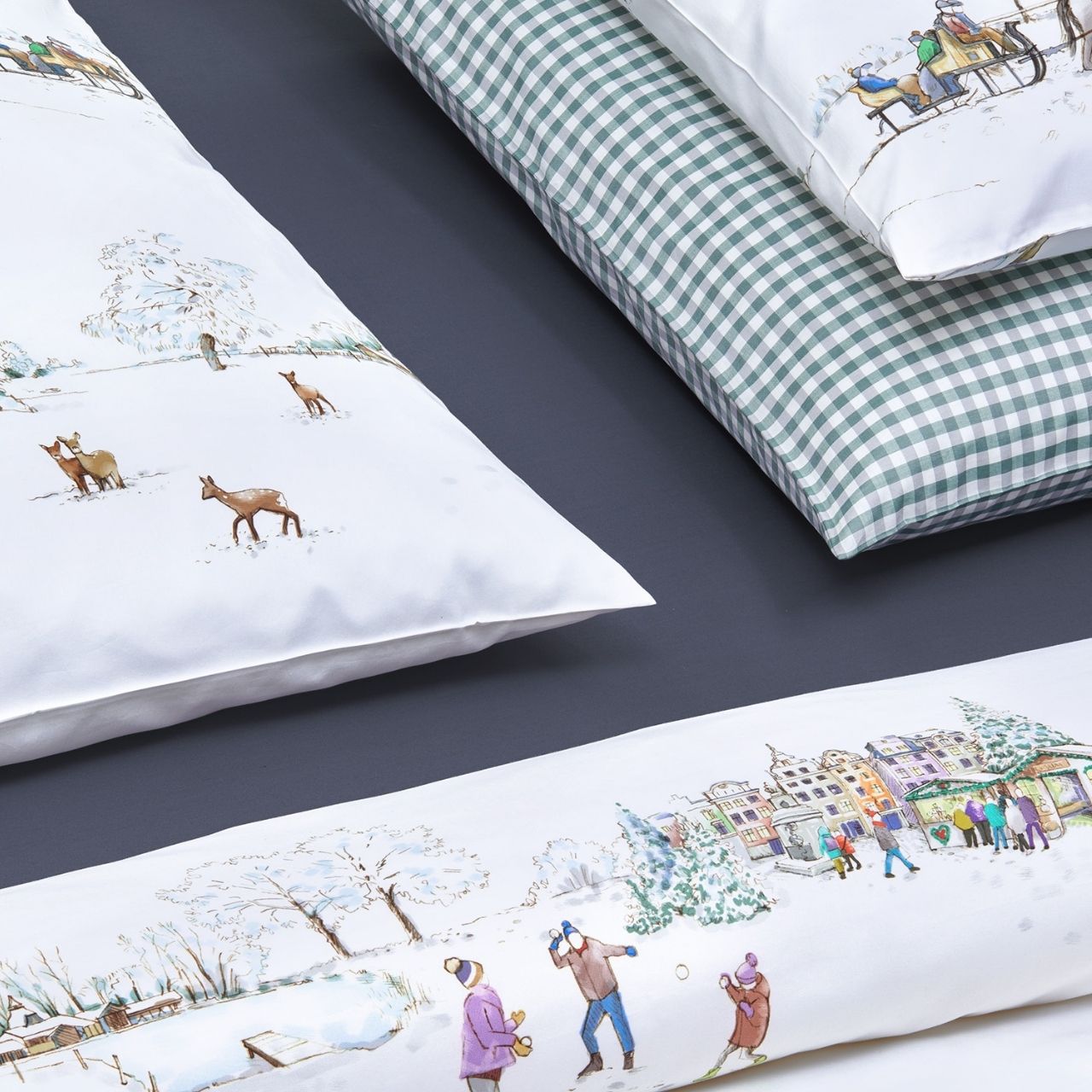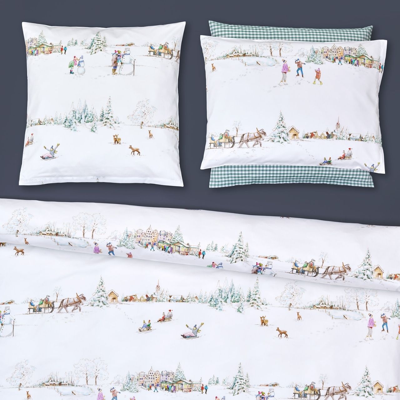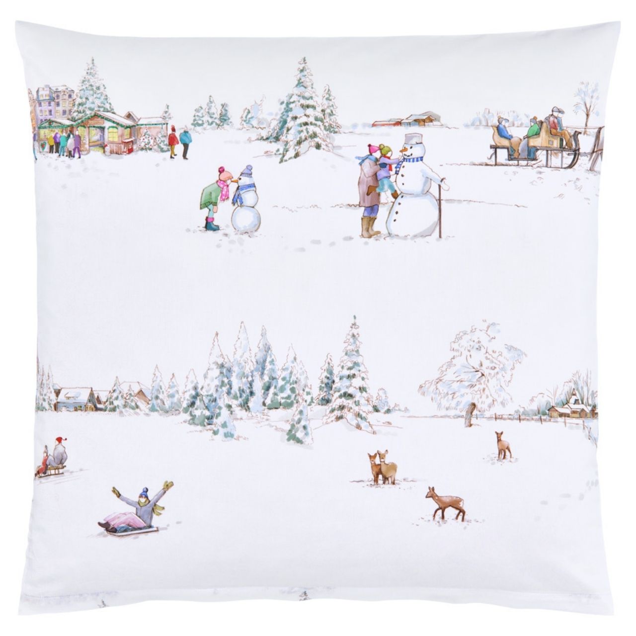 Das Dessin "Winterwonderland" der Satin-Bettwäsche von Christian Fischbacher bringt die Freuden des Winters - Schneemänner bauen, Schlitten fahren oder die Leckereien auf dem dörflichen Weihnachstsmark auf feinste, weiße Bettwäsche. Weiße Bettwäsche so rein wie frisch gefallener Schnee weckt mit den vielen weihnachtlichen Aktivitäten die nostalgische Sehnsucht nach der guten alten und manchmal auch gemütlichen Zeit