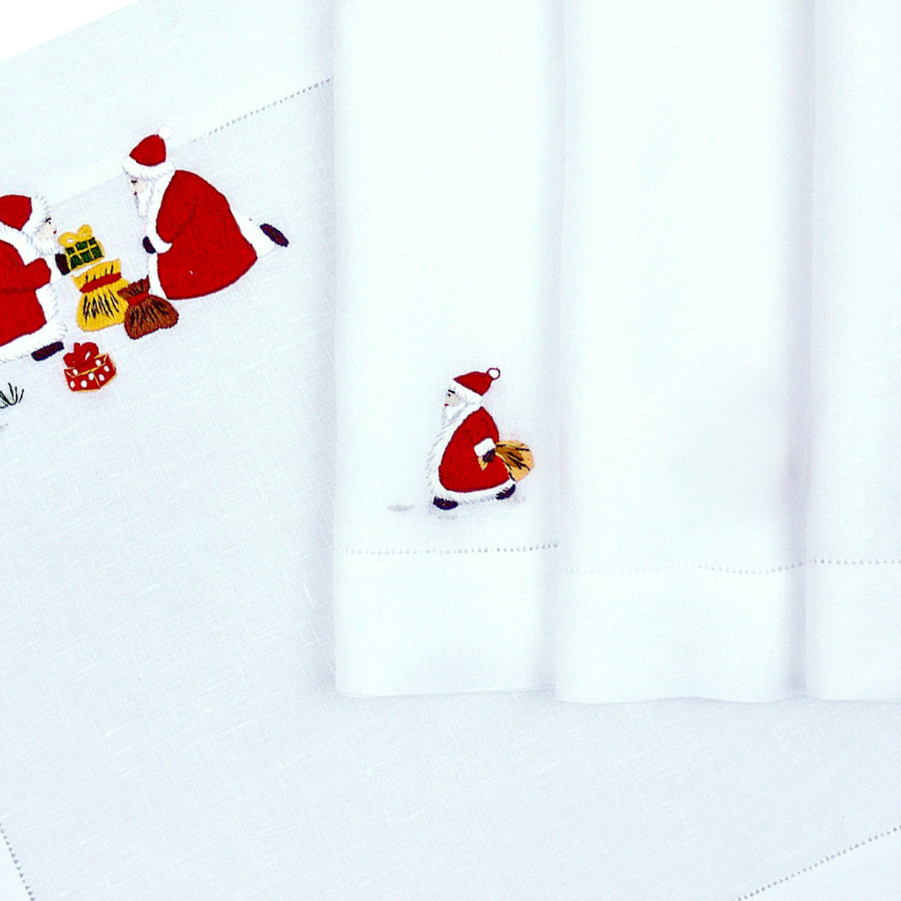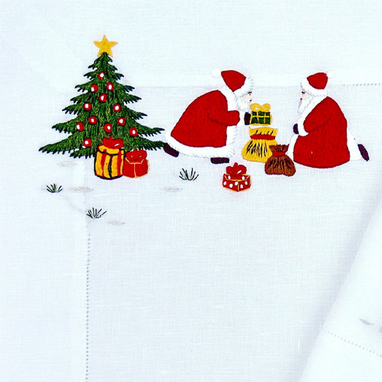 Die Leinentischwäsche "Santa Claus" präsentiert ERI TEXTILES handgestickt und in ihrer schönsten Form als elegante Tischwäsche mit Hohlsaum. Mit einer feinen Farbabstimmung und der Liebe zum Detail, verbreitet sie weihnachtliche Stimmung in Ihrem Esszimmer. Die von der Textilkünstlerin Erika Lassen entworfene Kollektion wird von erfahrenen Stickerinnen in aufwendiger Handarbeit umgesetzt und begeistert durch Eleganz, Präzision und Kreativität.