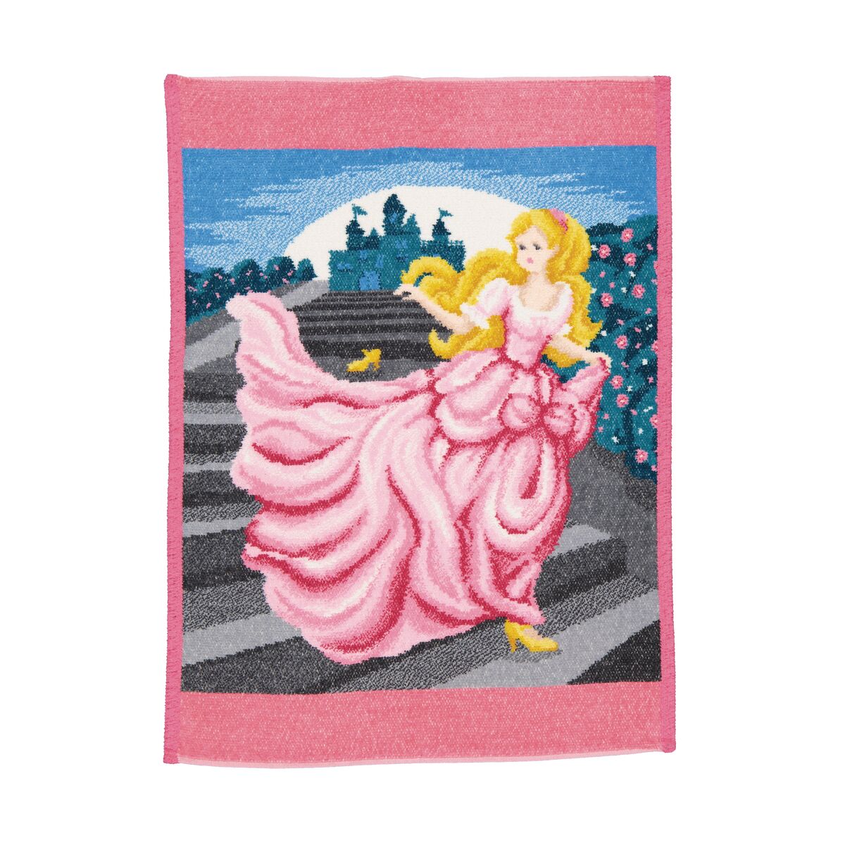 Das Chenilletuch „Aschenputtel“ aus der Feiler Mini-Serie bringt ein Stück Märchenzauber in den Alltag – ob im Kinderzimmer oder im Bad. Die Szene zeigt den magischen Moment, in dem Aschenputtel im prachtvollen rosa Ballkleid die Schlosstreppe hinabläuft und dabei ihren goldenen Schuh verliert. Eine romantisch anmutende Szenerie, die in liebevoller Detailarbeit gewebt wurde und zum Träumen einlädt.