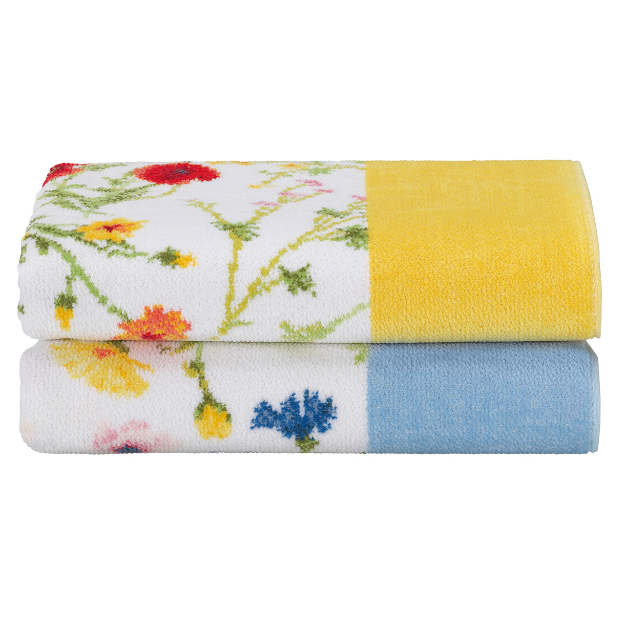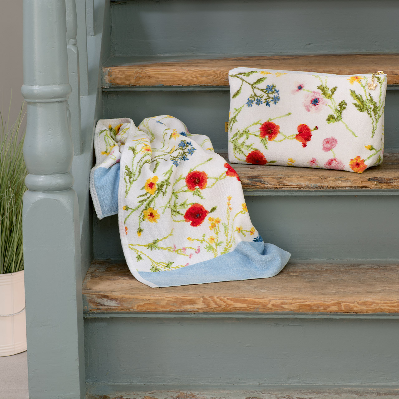 Das Dessin "Flower Meadow" von FEILER GERMANY zeigt zarte Blüten wie Mohn und Kornblumen einer Naturblumenwiese in edlem Chenille eingewebt. Durch diese besondere Gewebetechnik mit reiner Baumwolle wird jede Blume naturgetreu und farbenfroh dargestellt. Die eleganten Tücher sind in verschiedenen Größen und wahlweise mit gelber oder hellblauer Kantenfarbe lieferbar.