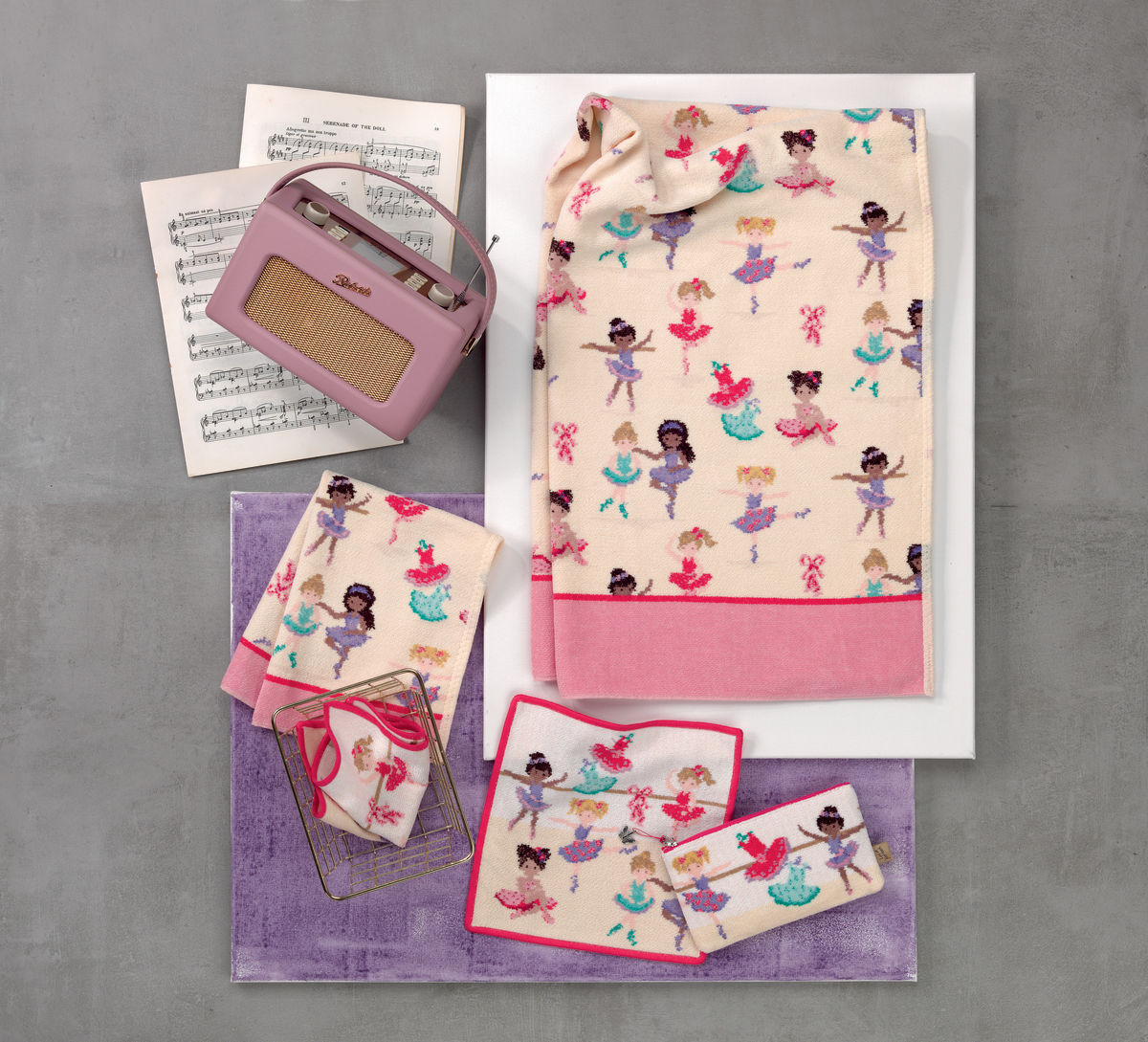 Das Dessin "Ballerina" von FEILER MINI lässt Kinderherzen höher schlagen. Es verbindet flauschiges Schlingengewebe mit doppelseitigen Chenillebordüren, wodurch das hochwertige Dessin zum perfekten Begleiter für den Tanzunterricht wird.