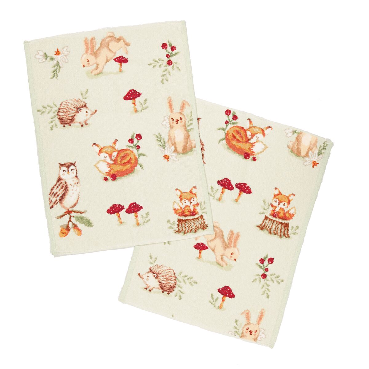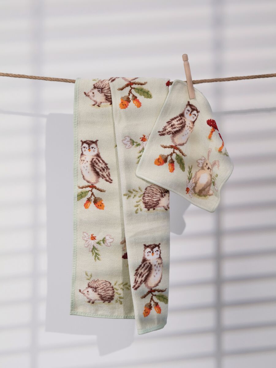 Das Chenilletuch „Forest Tales“ von Feiler Mini zeigt ein liebevoll gestaltetes Waldtier-Motiv auf einem zarten cremefarbenen Hintergrund. Die Szenerie beinhaltet detailreich gezeichnete Tiere wie eine Eule, Fuchs, Hase und Igel, eingebettet in eine märchenhafte Waldlandschaft mit Fliegenpilzen, Beeren und Blüten. Die Farbpalette besteht aus warmen Naturtönen wie Zimtbraun, Rostorange, Creme, Blassrosa und kräftigem Rot, die eine heimelige, kindgerechte Atmosphäre schaffen. Die Illustrationen wirken weich, verspielt und freundlich – perfekt für eine warme, behagliche Umgebung. Das Plüschgewebe aus reiner Baumwolle wird in einer speziellen Webtechnik so verarbeitet, dass die Muster auf Vorder- und Rückseite identisch sind.