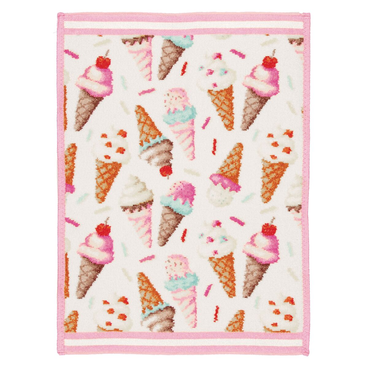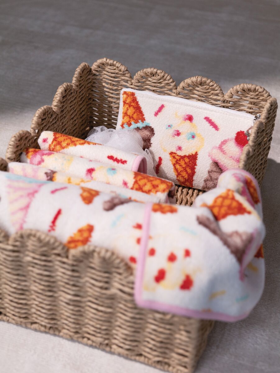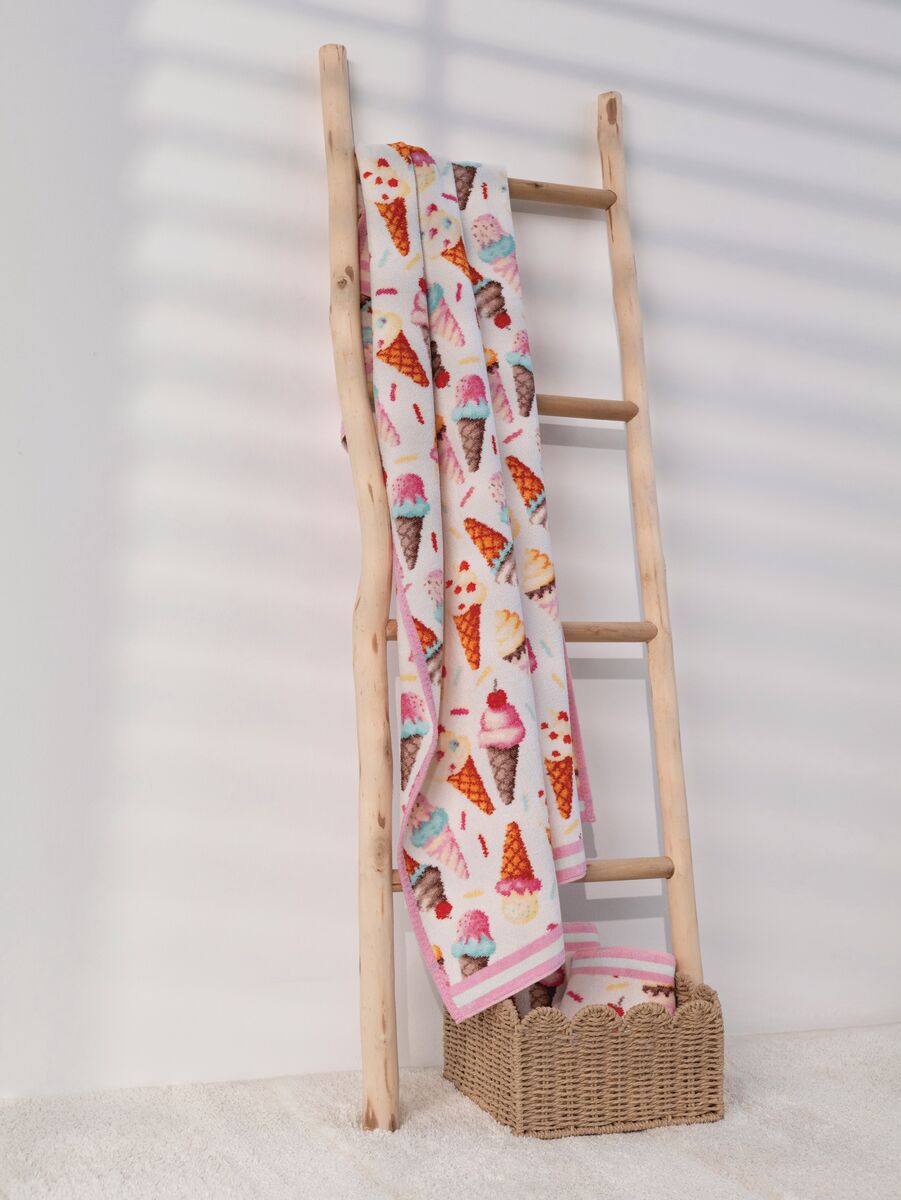 Ein Hauch von Sommer, ein Lächeln auf den Lippen – das Chenilletuch „Sweet Sprinkle“ von Feiler Mini verzaubert mit einem liebevoll gestalteten Eismotiv in zarten Pastelltönen und kräftigen Akzenten. Die süßen Eiswaffeln mit Sahnetupfern, Kirschen und bunten Streuseln schaffen eine spielerische, fröhliche Atmosphäre, die Kinder ebenso begeistert wie Erwachsene. Der rosa Streifenrand rundet das Design stilvoll ab und macht das Tuch zu einem charmanten Blickfang – ob im Badezimmer, im Kinderzimmer oder als dekoratives Accessoire. Ideal als liebevolles Geschenk oder einfach für sich selbst – „Sweet Sprinkle“ macht jeden Tag ein bisschen süßer.