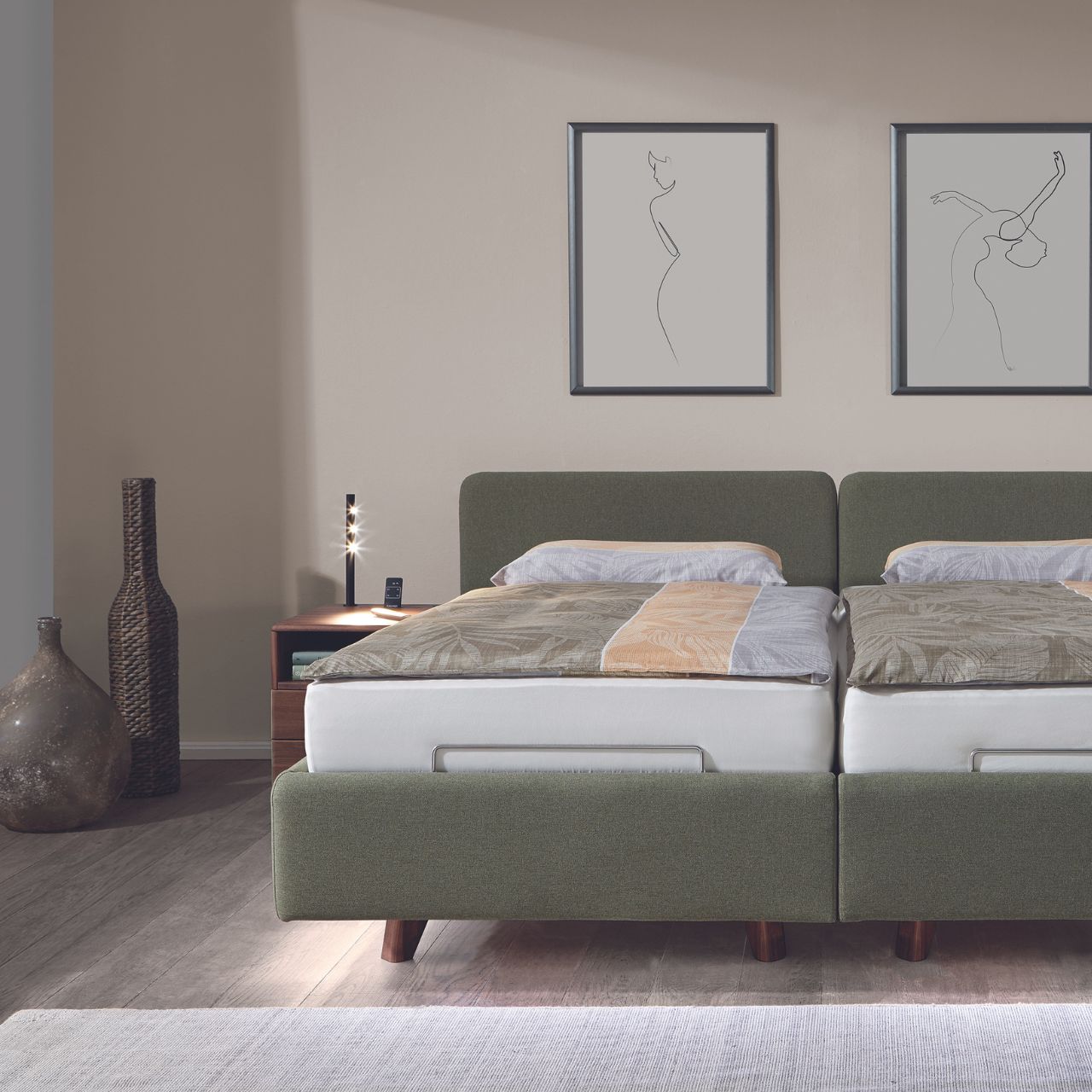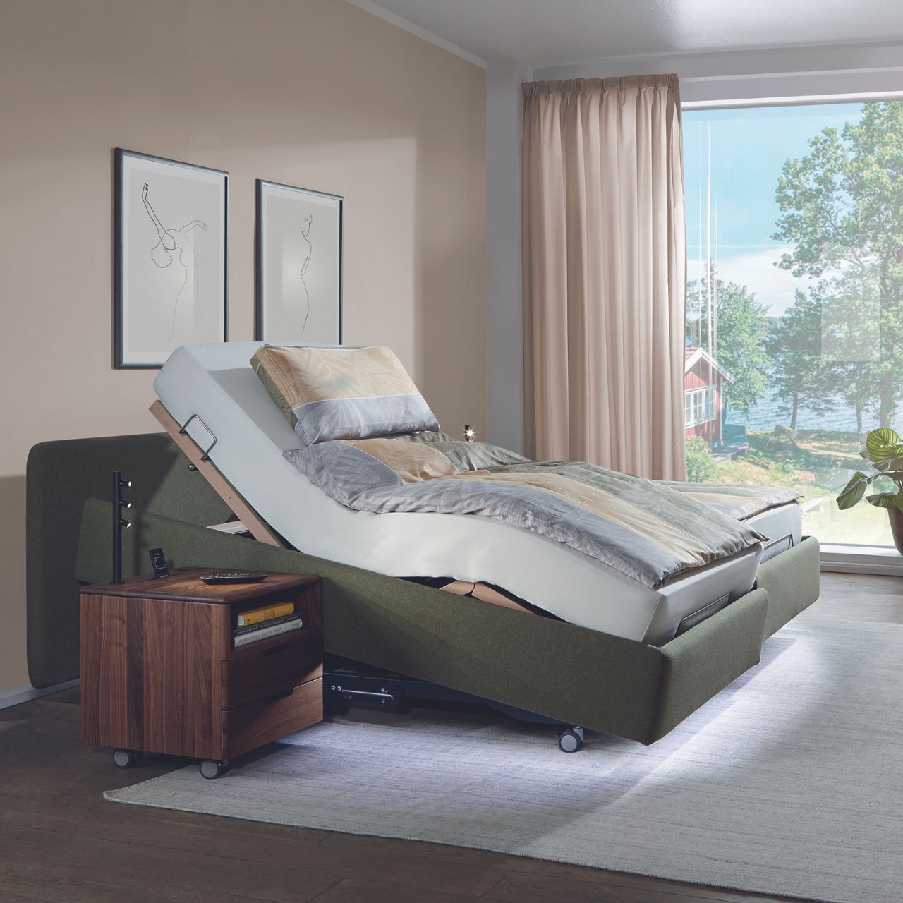 Die unsichtbare motorische Höhenverstellung und die motorisch verstellbare Liegefläche sind per Fernbedienung einstellbar. Die optionalen Seitenherausfallschutz-Panels und eine belastbare Aufrichthilfe geben Ihnen immer das Gefühl, eine sichere Unterstützung zur Seite zu haben. Für die Vorteile mühelosen Aufstehens können Sie sich in der Boxlike-Variante auch als Einzel- oder Doppelbett entscheiden.