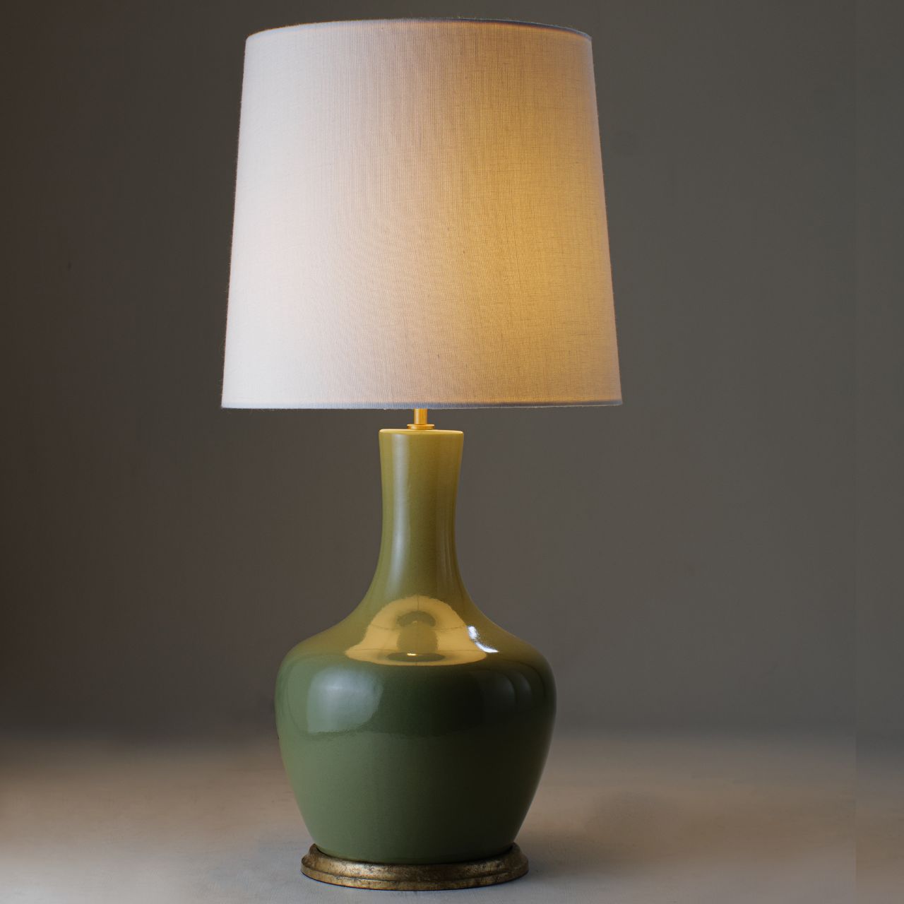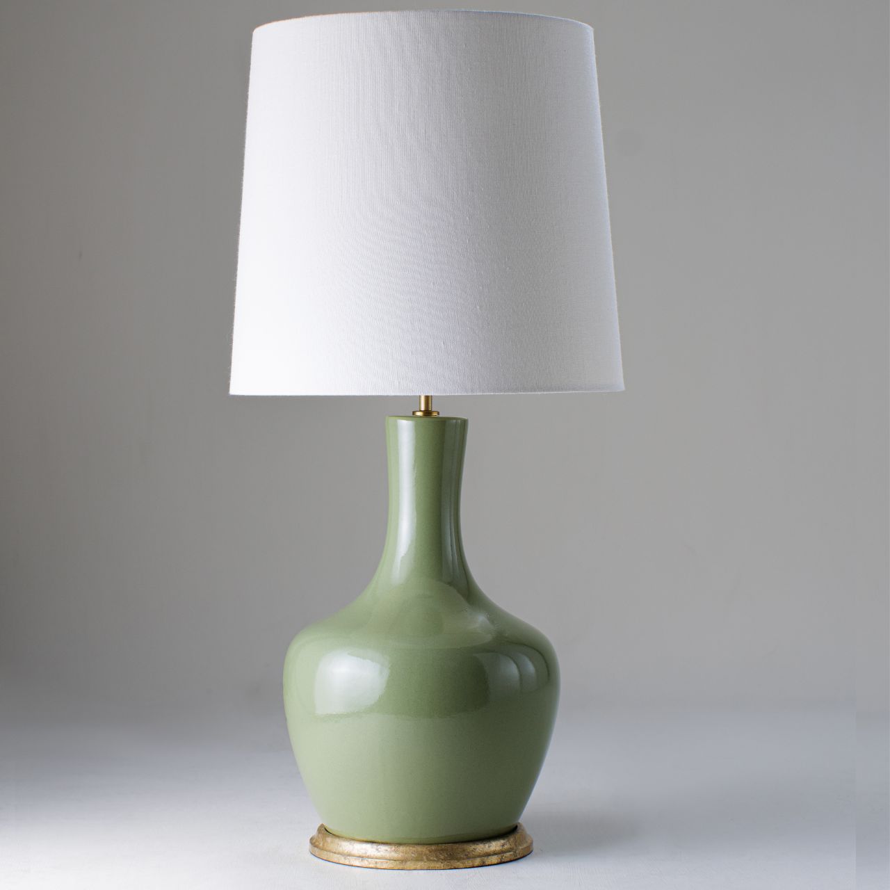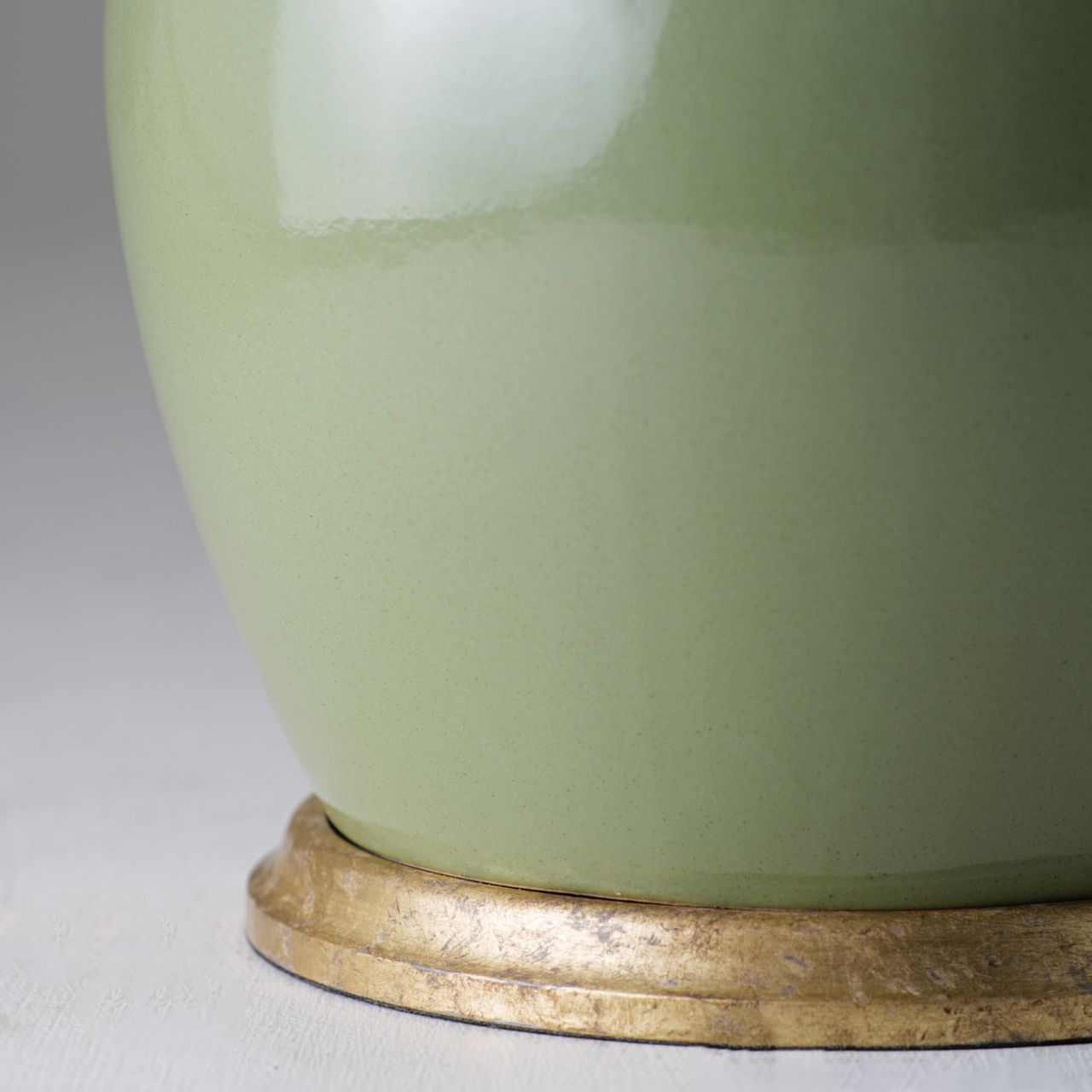 Die "Rigby" Leuchte zeichnet sich durch ihren sanft geschwungenen Korpus aus, der in einer subtilen, glänzenden grünen Glasur gehalten ist. Der Leuchtenfuß sitzt auf einem stabilen, antik vergoldeten Sockel, der einen Hauch von klassischer Eleganz hinzufügt. Der schlichte, weiße Lampenschirm streut das warme Licht angenehm und sorgt für eine einladende Beleuchtung.