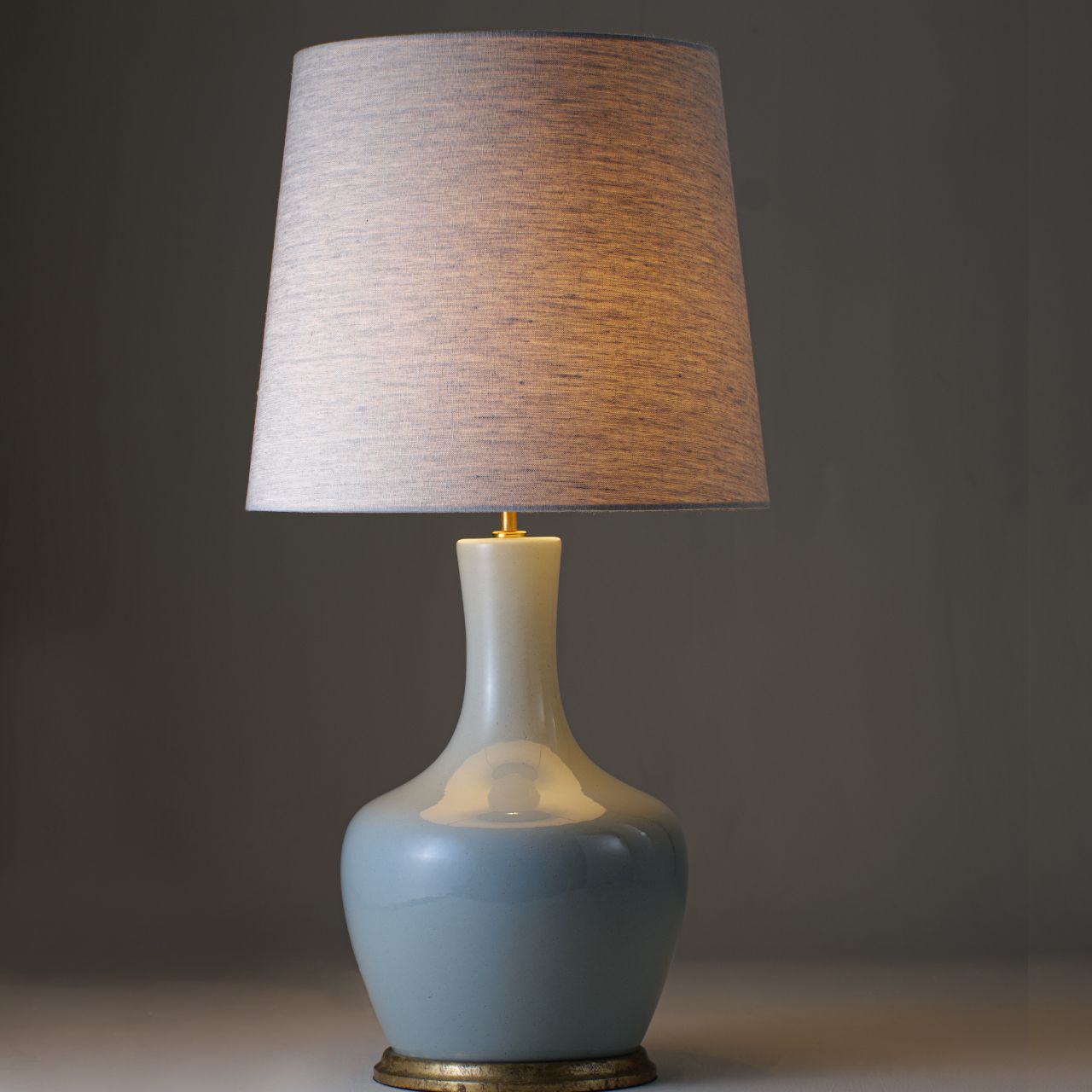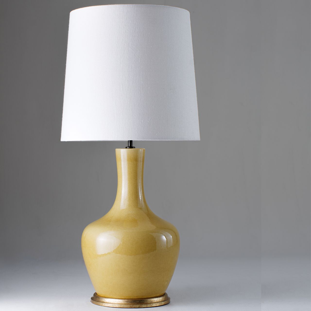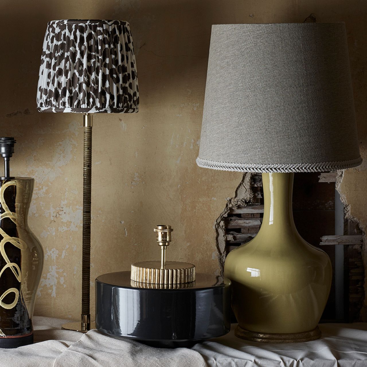 Die "Rigby" Leuchte zeichnet sich durch ihren sanft geschwungenen Korpus aus, der in einer subtilen, glänzenden grünen Glasur gehalten ist. Der Leuchtenfuß sitzt auf einem stabilen, antik vergoldeten Sockel, der einen Hauch von klassischer Eleganz hinzufügt. Der schlichte, weiße Lampenschirm streut das warme Licht angenehm und sorgt für eine einladende Beleuchtung.