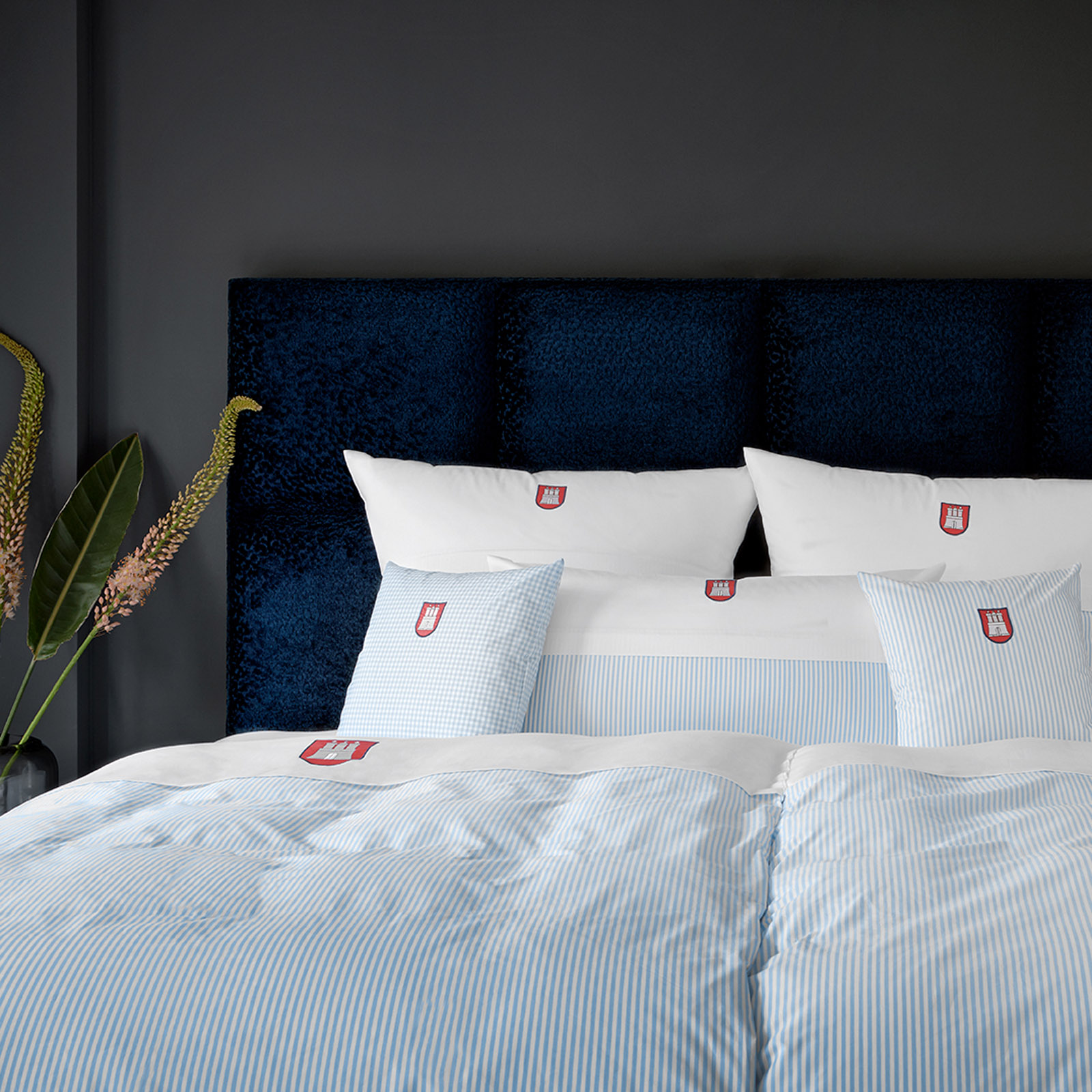 - Blau/weiss gestreifte Wende-Bettwäsche mit eingesticktem, kleinen Hamburg Wappen auf dem Kopfkissen bzw. im Hut-Bereich