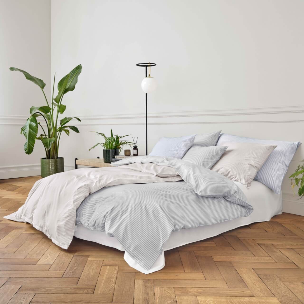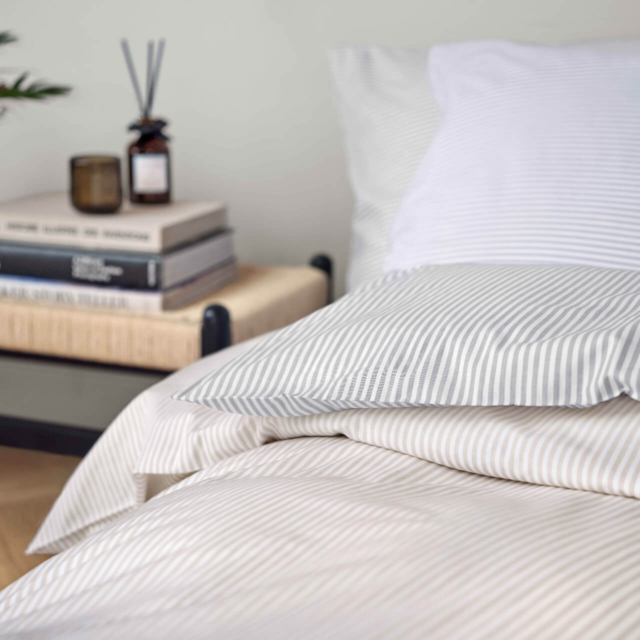 Die gestreifte Bettwäsche "Bari" von Schlossberg Switzerland bringt moderne, sportliche Eleganz in Ihr Schlafzimmer. Die Streifen auf weißem Grund werden durch die hochwertige Popeline Qualität perfekt ergänzt, was die Garnitur geschmeidig weich für die Haut macht. Sie erinnert an einen Tag am Meer oder auf dem Boot. Das leichte Gewebe in beige, bleu oder gris hält für uns die schönsten Einnerungen an einen leichten, sonnigen Sommer wach.