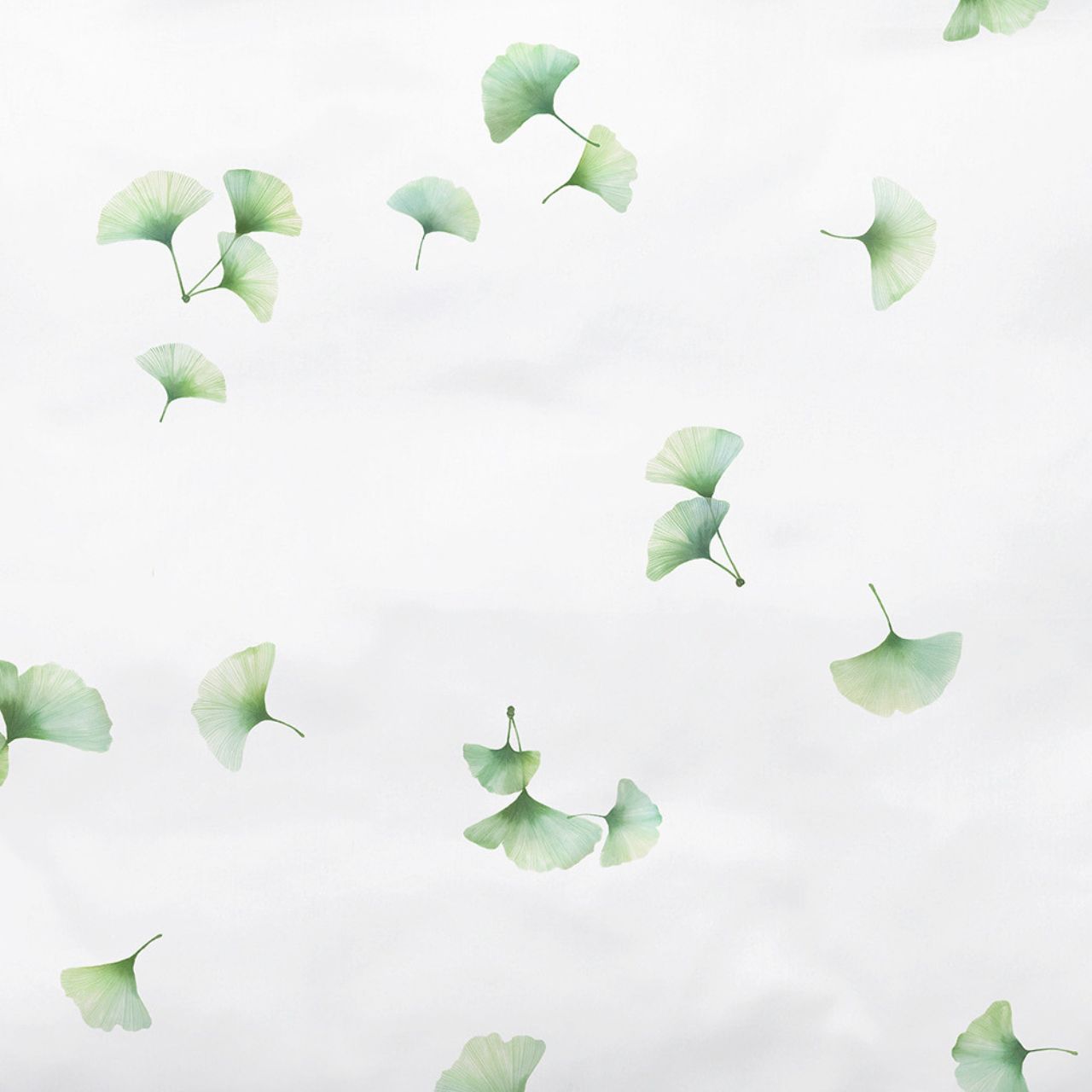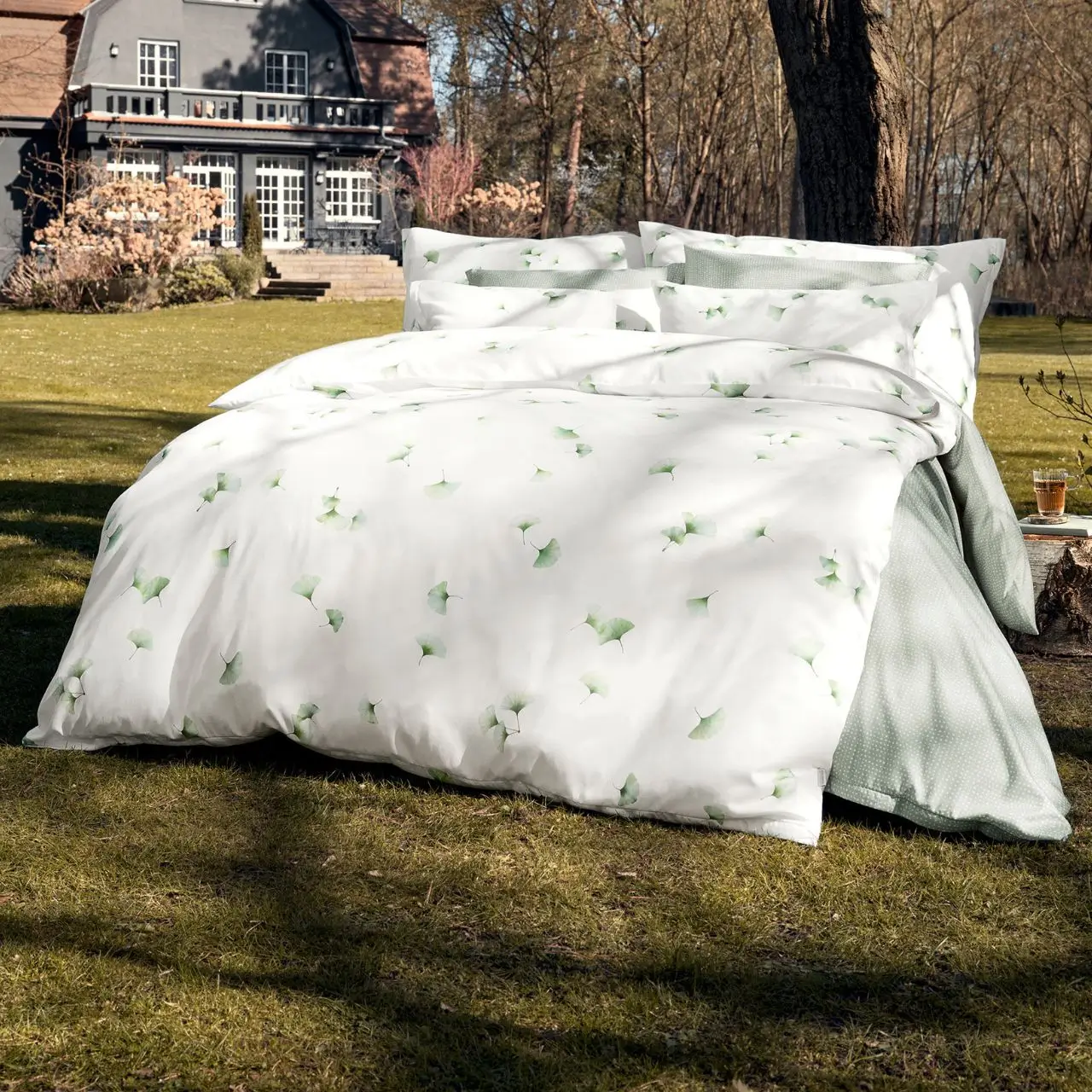 Die Bettwäsche „Aiko“ von Schlossberg Switzerland verleiht jedem Schlafzimmer eine frische, natürliche Leichtigkeit. Das filigrane Dessin mit zartgrünen Ginkgo-Blättern auf strahlend weißem Hintergrund bringt eine ruhige, harmonische Atmosphäre in Ihr Zuhause und lässt den Raum gleichzeitig modern und lebendig wirken. Das dezente Ginkgo-Motiv wirkt wie handgemalt und schafft einen eleganten Akzent – ideal für Liebhaber stilvoller, naturinspirierter Designs. Die sanften Grüntöne entfalten auf dem weißen Fond eine beruhigende Ausstrahlung, die sowohl zu modernen als auch klassischen Einrichtungen passt.