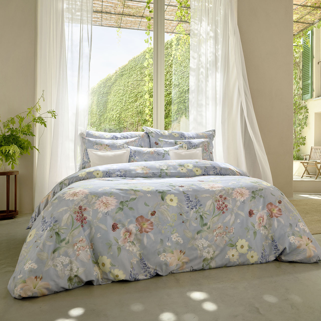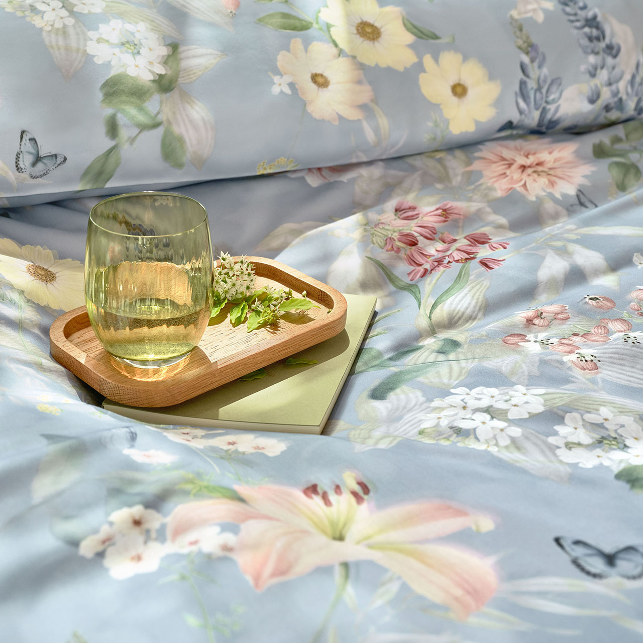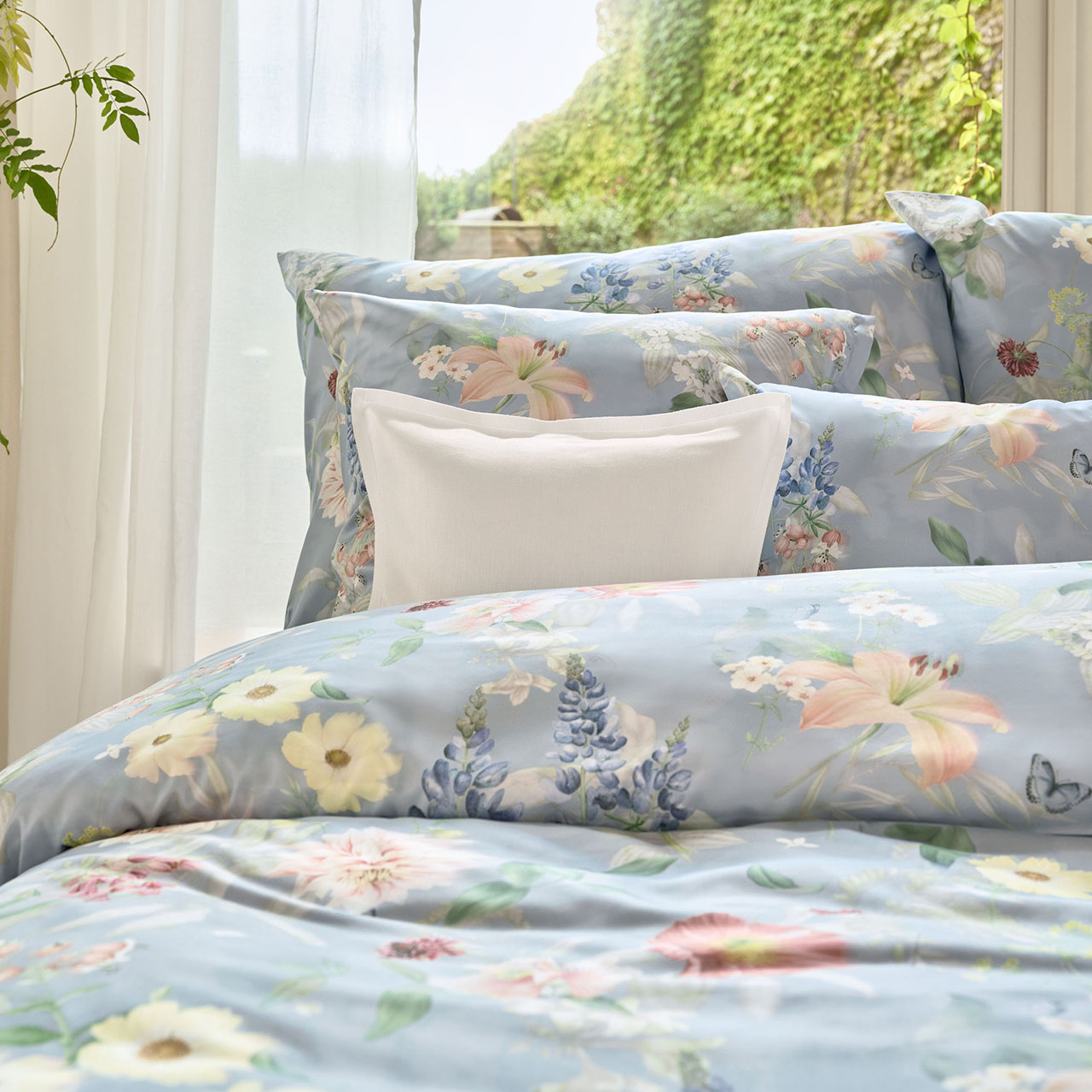 Die Bettwäsche Schlossberg Switzerland Aven begeistert mit einem fein ausgearbeiteten Blumenmotiv auf einem sanften hellblauen Fond. Zarte Blüten in Rosé, Apricot, Cremegelb und Weiß entfalten sich zwischen frischen Grüntönen und filigranen Blättern. Ergänzt wird das Dessin durch kleine Wildblumen, feine Rispen und botanische Details, die wie eine liebevoll komponierte Gartenlandschaft wirken. Die Mischung aus großen Blüten und leichten floralen Akzenten erzeugt eine harmonische, luftige Optik mit romantischem Charakter.