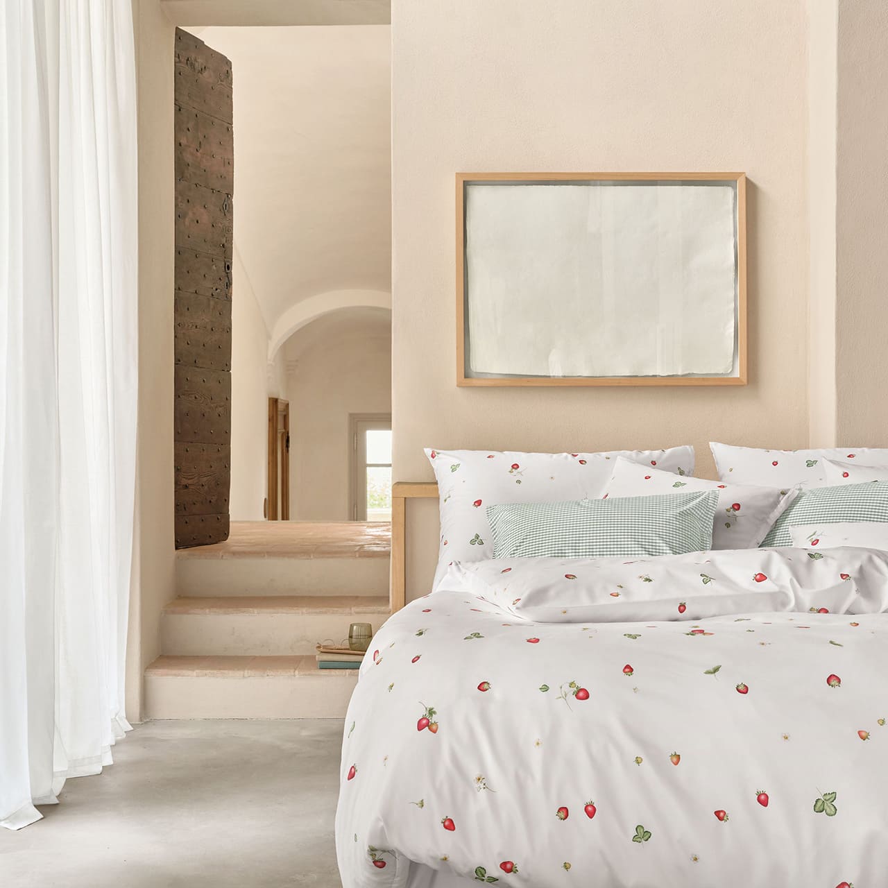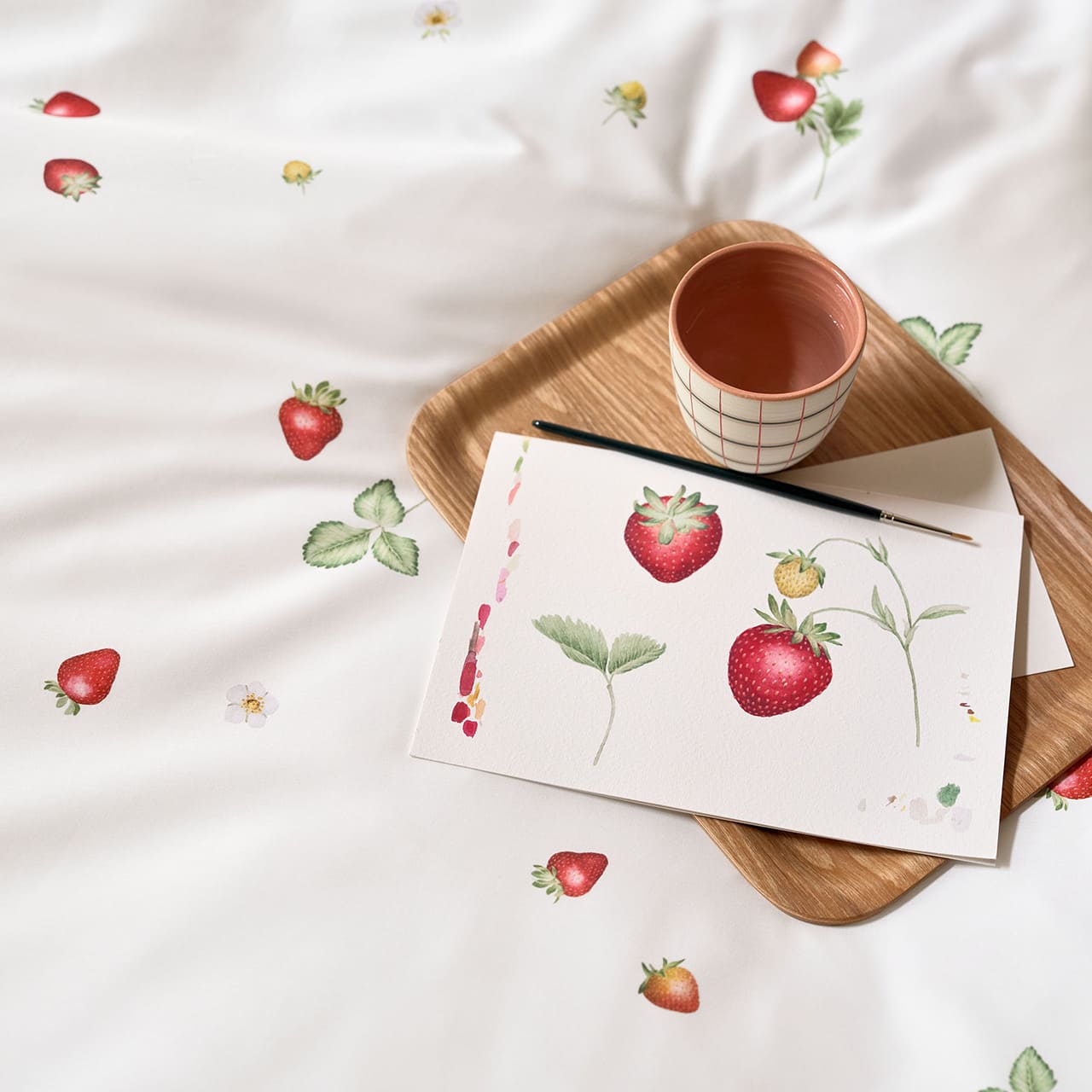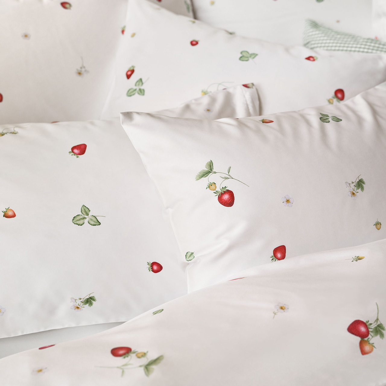 Die Bettwäsche June von Schlossberg Switzerland bringt eine leichte, sommerliche Ausstrahlung ins Schlafzimmer und verleiht dem Raum eine frische, natürliche Eleganz. Die fein abgestimmte Optik zeigt handgezeichnet wirkende Erdbeeren in unterschiedlichen Reifestadien, ergänzt durch kleine Blätter und zarte Blüten. Die lockere Streuung der Motive erzeugt ein luftiges Bild, das sowohl harmonisch als auch hochwertig wirkt. Die Farbstellung ist exklusiv in Weiß mit roten und grünen Akzenten erhältlich und passt sich wunderbar hellen wie auch natürlichen Schlafzimmerkonzepten an.