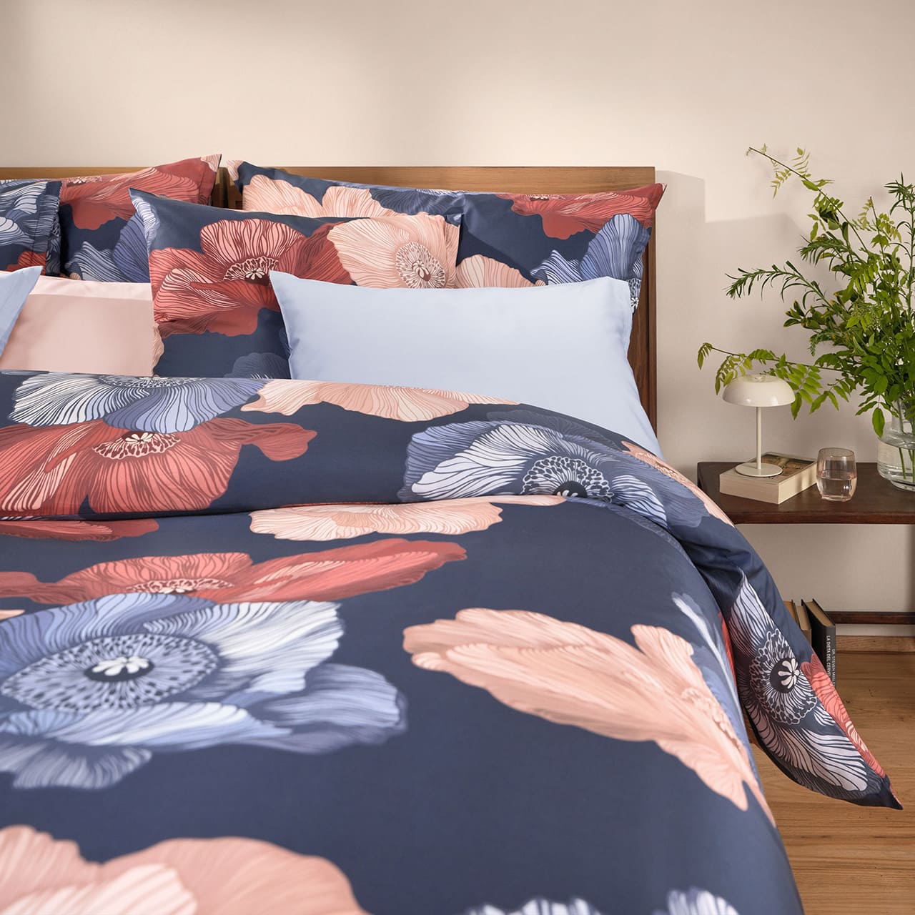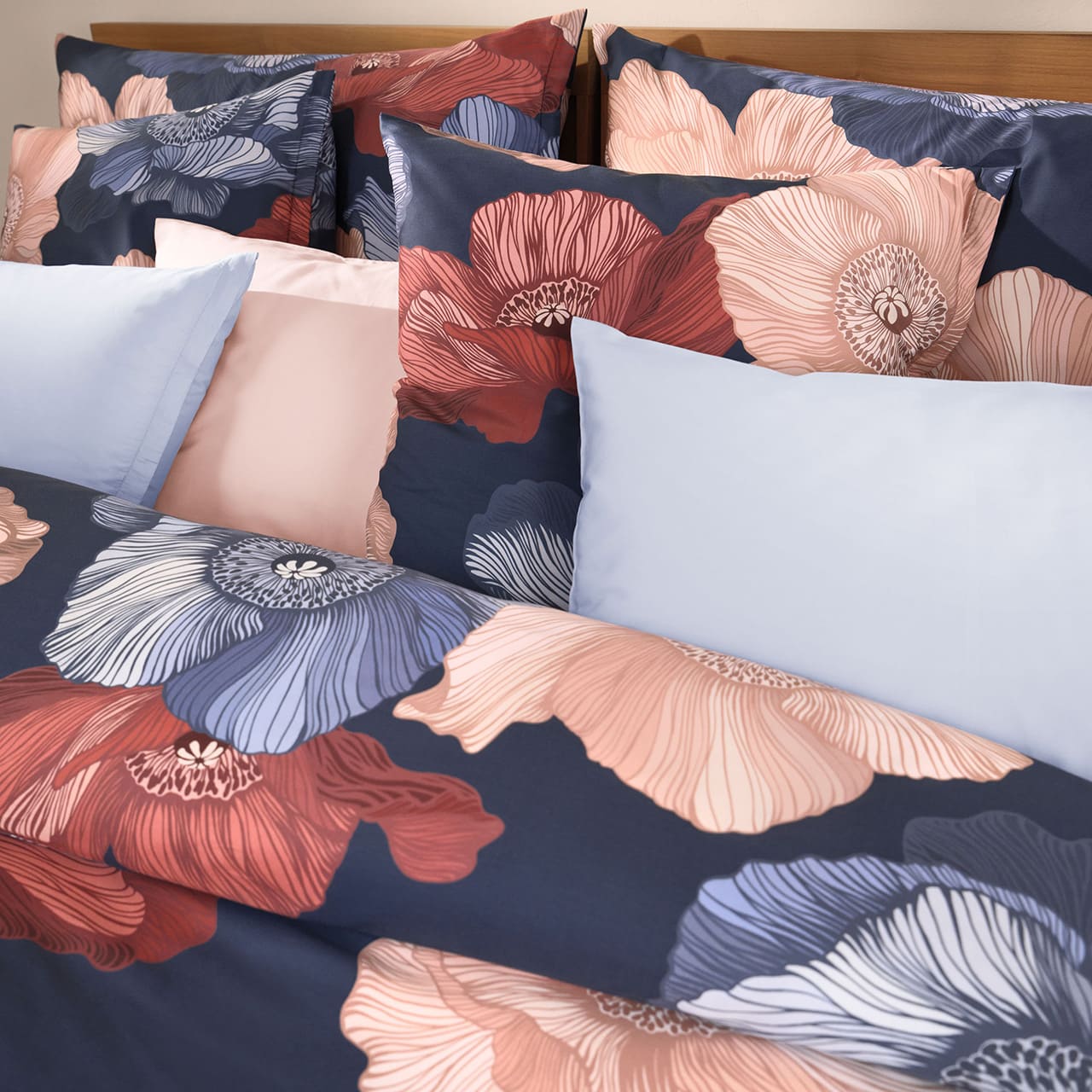 Bei der Satin Bettwäsche „Mona“ von Schlossberg Switzerland setzen die kunstvoll gestalteten Blüten stilvolle Akzente und lassen den Raum in einem harmonisch abgestimmten Farbspiel erstrahlen. Das Design besticht durch großformatige florale Motive in Rosé, Creme, warmen Rottönen sowie blaugrauen Nuancen, die sich kontrastreich vom tiefen Navy-Blau des Hintergrunds abheben. Fein gezeichnete Linien und die liebevolle Detailarbeit in den Blütenblättern verleihen dem Muster eine eindrucksvolle Tiefe und zeitlose Eleganz. Die Farbstellung ist bewusst auf eine exklusive Variante reduziert, die das hochwertige Design optimal unterstreicht.
