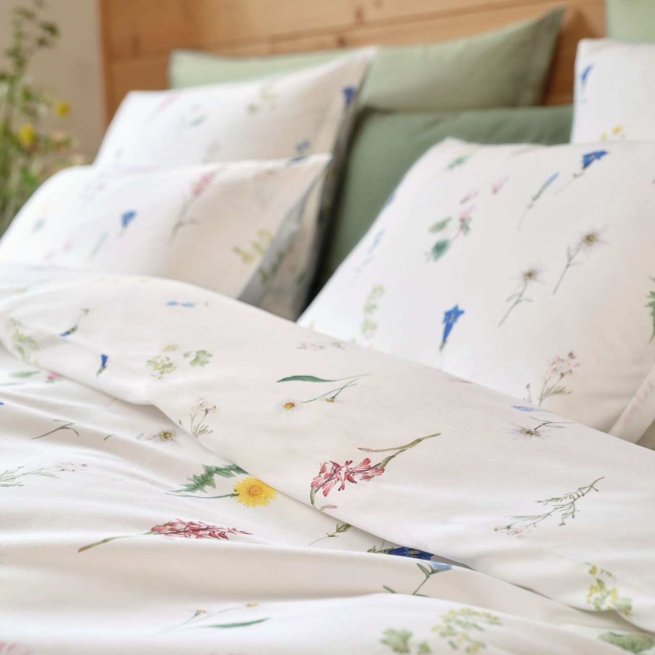 Die Bettwäsche "Flurina" von Schlossberg Switzerland vereint nostalgischen Charme mit frischem Alpenflair. Inspiriert von den Kostbarkeiten einer blühenden Alpensommerwiese und alten botanischen Illustrationen, zeigt das Design zarte Bergblumen in Enzianblau, Sonnengelb und Veilchenrosa, begleitet von feinem Blattgrün. Die Motive strahlen eine klare, luftige Leichtigkeit aus, die an die unberührte Natur der höheren Alpenregionen erinnert. "Flurina" bringt diese natürliche Eleganz und ein Gefühl von reiner, unberührter Schönheit direkt in Ihr Schlafzimmer.