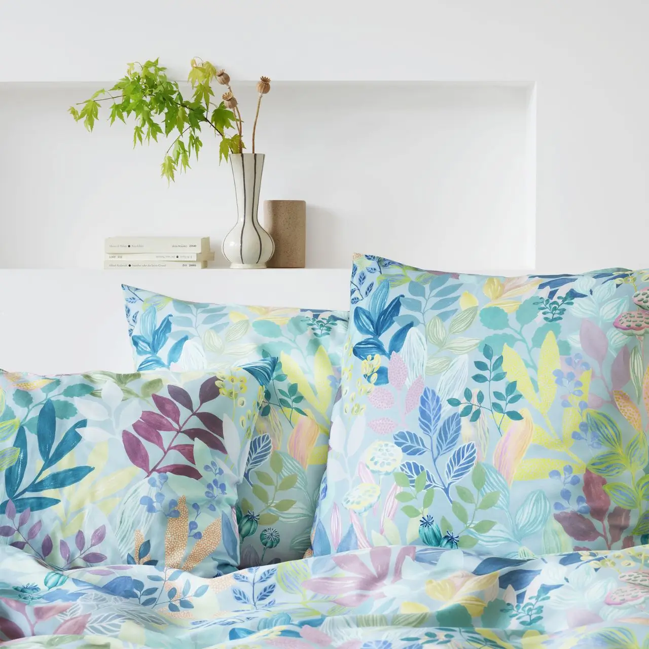 Ein kunstvolles Blättermeer in zarten Pastelltönen: Die Bettwäsche „Frida“ von Schlossberg Switzerland bringt die Schönheit der Natur direkt in Ihr Schlafzimmer. Das detailreiche florale Muster in sanften Blau-, Grün-, Gelb-, Rosa- und Violetttönen verleiht Ihrem Zuhause eine frische, lebendige Atmosphäre.