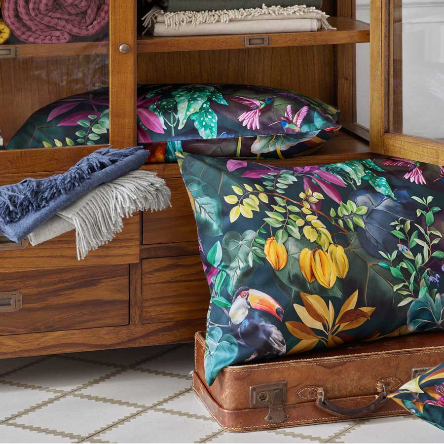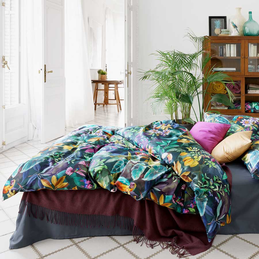 Unsere tiefe Sehnsucht nach der exotischen Fremde wird mit der Satin-Bettwäsche "Jane" von SCHLOSSBERG SWITZERLAND in jeder Nacht erfüllt. Der bunte Tucan sitzt auf saftig grünen Blättern neben leuchtenden Passionsblumen und Exoten wie Lilien und Fuchsien. Ein goldglänzender Papagei ist nur einen Hauch entfernt von schimmernden Kolibris und doch in der grün schimmernden Dschungel-Nacht kaum zu erahnen.
