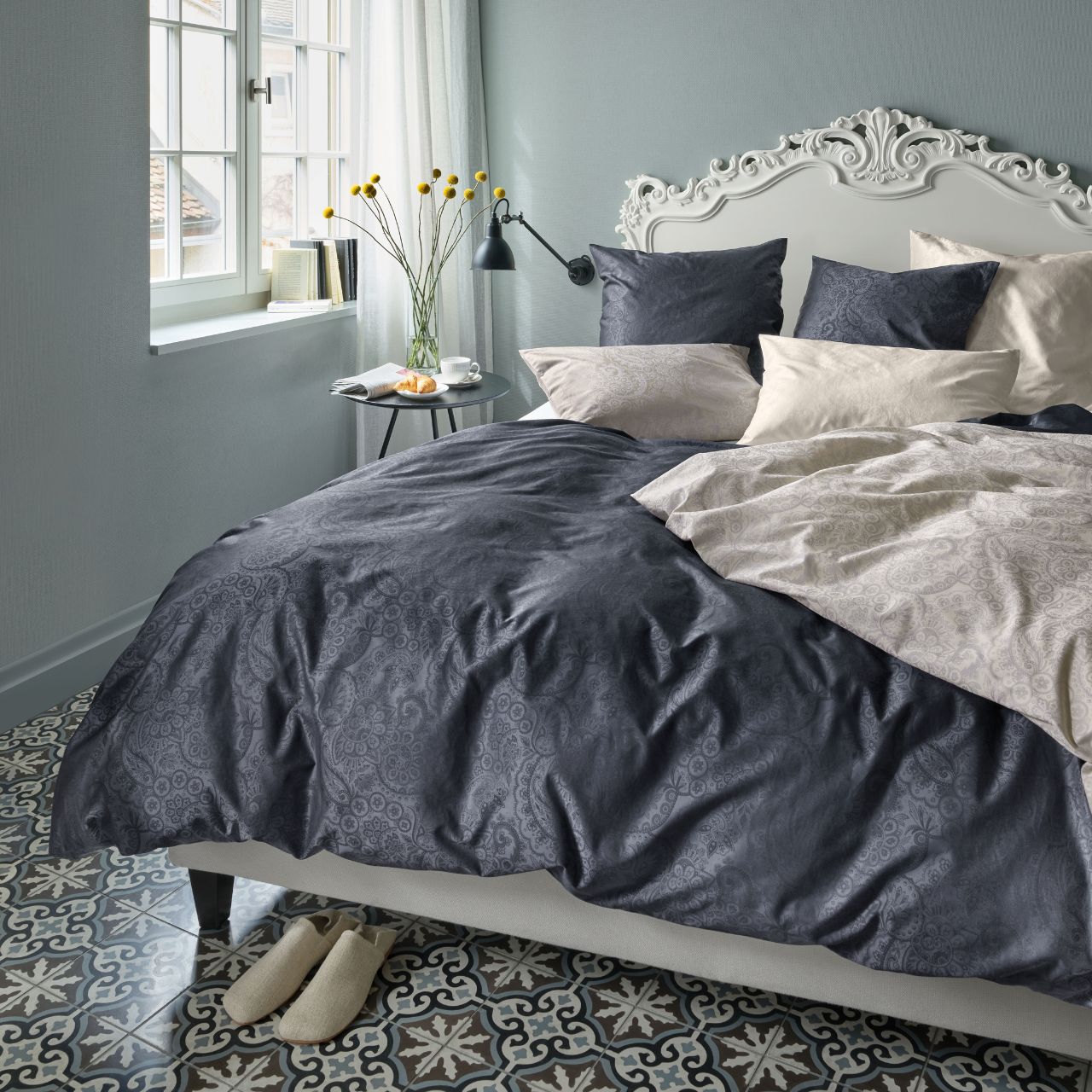 Jacquard-Gewebe aus 100% Baumwolle werden stückgefärbt und schaffen so hochwertige, formenreiche und eingewobene Muster. Diese Muster entstehen durch das Abwechseln von Kett- und Schussfäden. Je nach Lichteinfall entstehen unterschiedliche, unvergleichlich schöne Hell/Dunkel-Musterungen sowohl glänzend, als auch mattschimmernd.