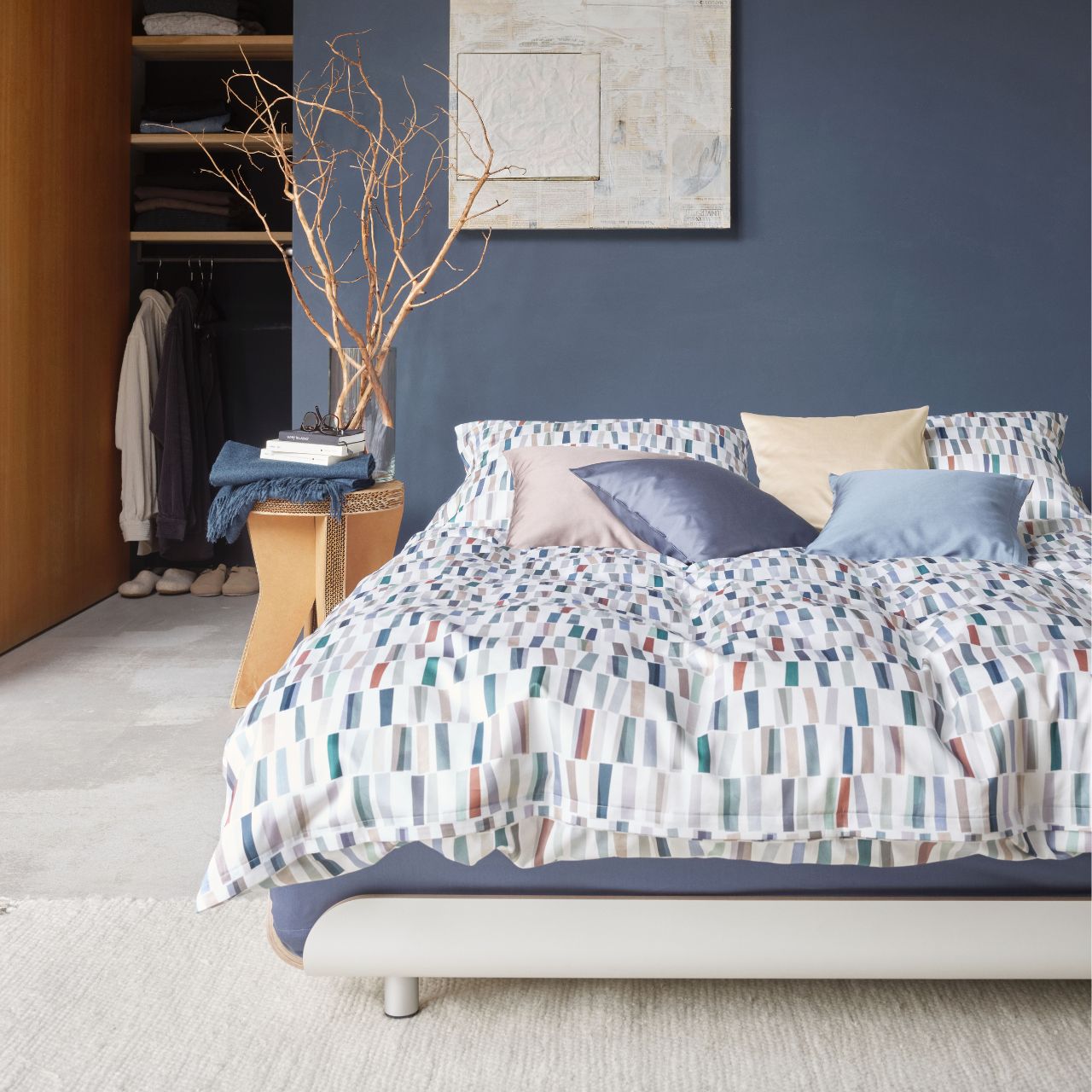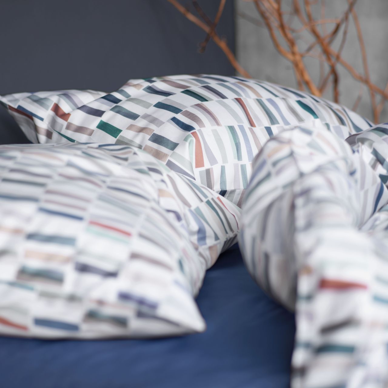 Die Satin-Bettwäsche "Vito" von SCHLOSSBERG SWITZERLAND gibt mit ihren leichten Schnipseln in kräftigen Blau- und Grüntönen, sowie den dezenten Grau- und Beigetönen, bis hin zu einem eleganten Rostrot Ihrem Schlafraum einen modernen und klaren Look.