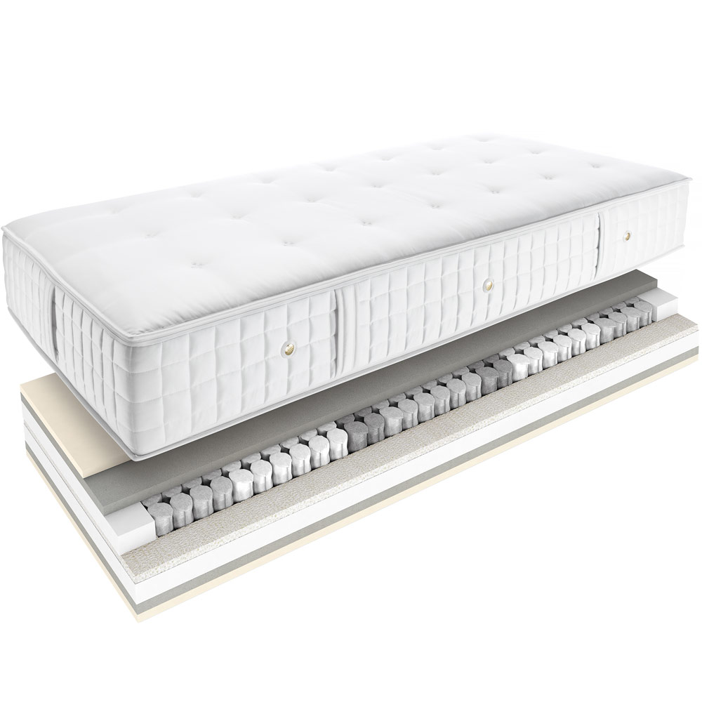 Die Taschenfederkernmatratze "Mon Bijou" mit Drellbezug von SUPERBA ATELIER SUISSE ist durch die Komfortzonen für Schultern, Gesäss und Lendenwirbel und das Zwischenpolster aus Latex sowie Komfortschaum besonders komfortable. Die Polsterauflage aus 700 gr./m² natürlichen Materialien (Seide, Kaschmir und Lammschurwolle sorgt für eine ausserordentlich gute Klimaregulierung und einen exzellenten Feuchtigkeitstransport. Der Drell-Bezug sorgt für ein eher festeres Liegegefühl.