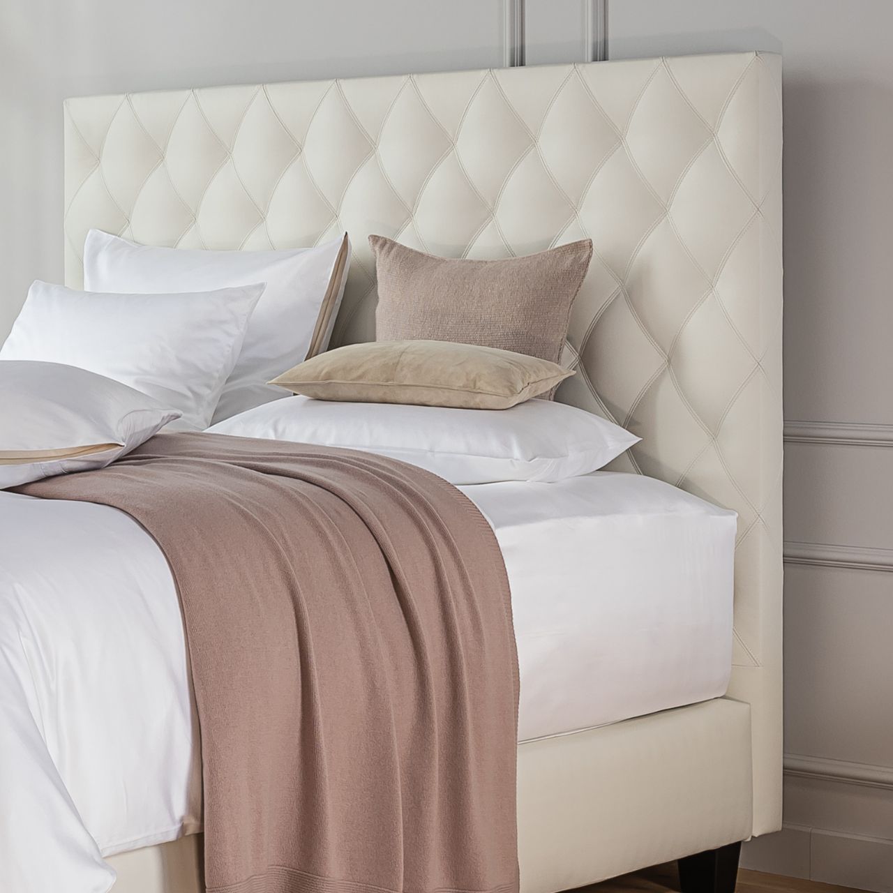 Das Besondere am 150cm hohen Kopfteil "Diamant" von TRECA PARIS ist die mit doppelten Kappnähten aufwendige Polsterung. Sie gibt der Form extra Volumen und reflektiert das Licht durch den Richtungswechsel von Stoff bzw. Leder, wie bei einem wertvollen Edelstein.