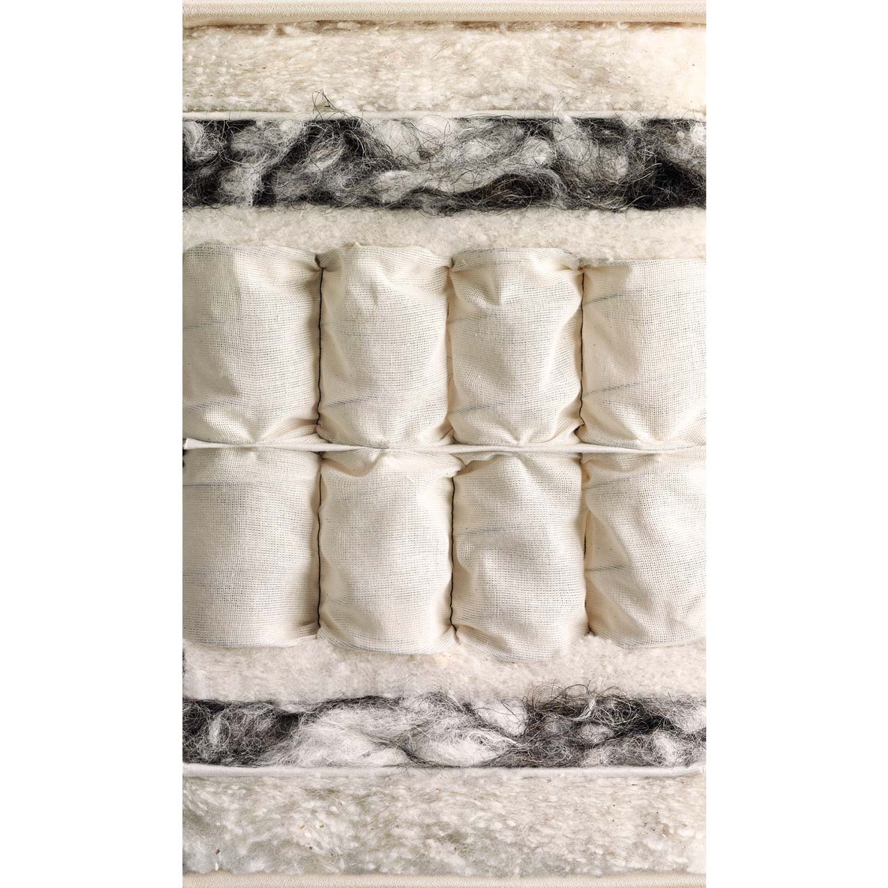 - Zwei Lagen, in Kaliko-Baumwolltaschen eingenähte, Federn (Durchmesser 54 mm), von Hand wabenförmig angeordnet.