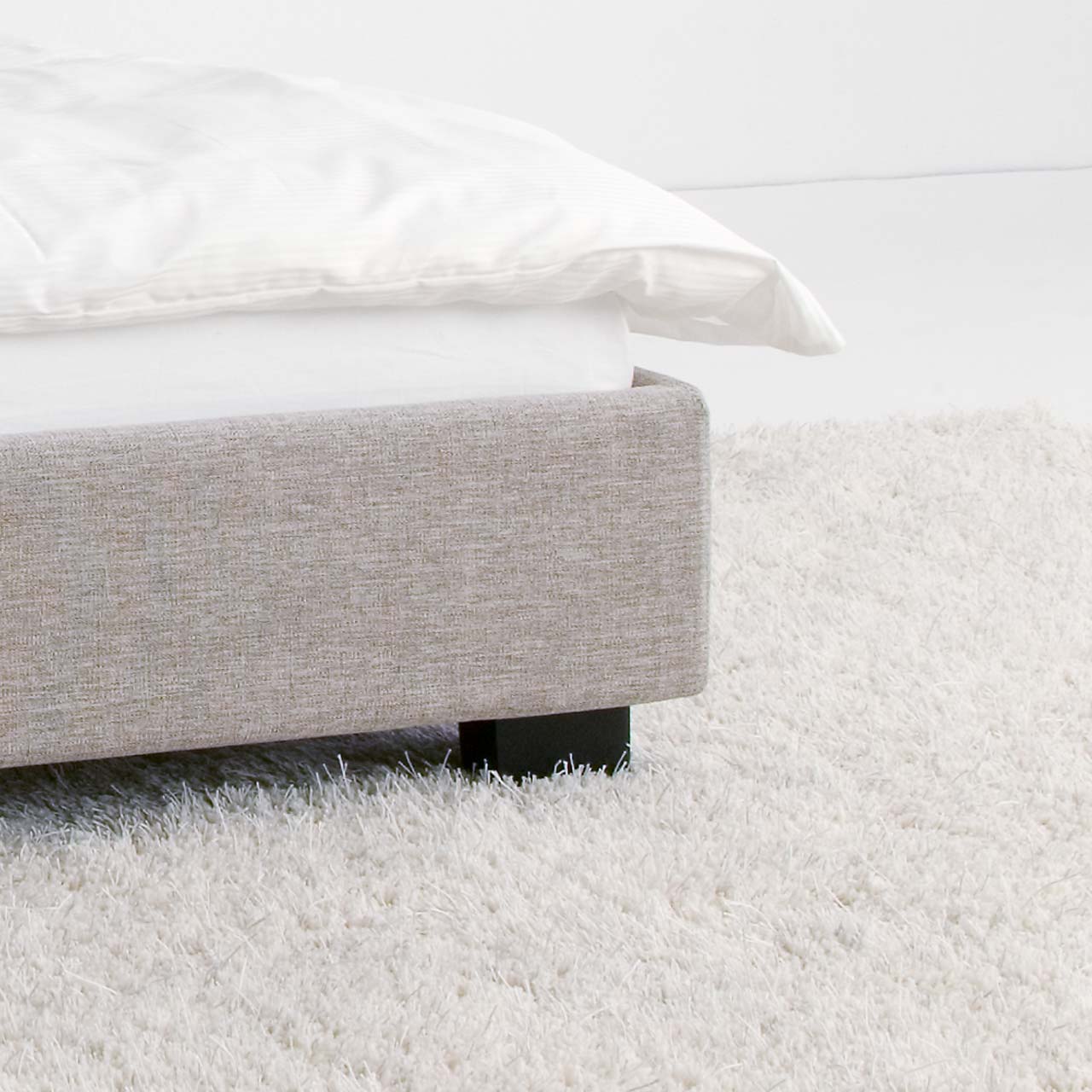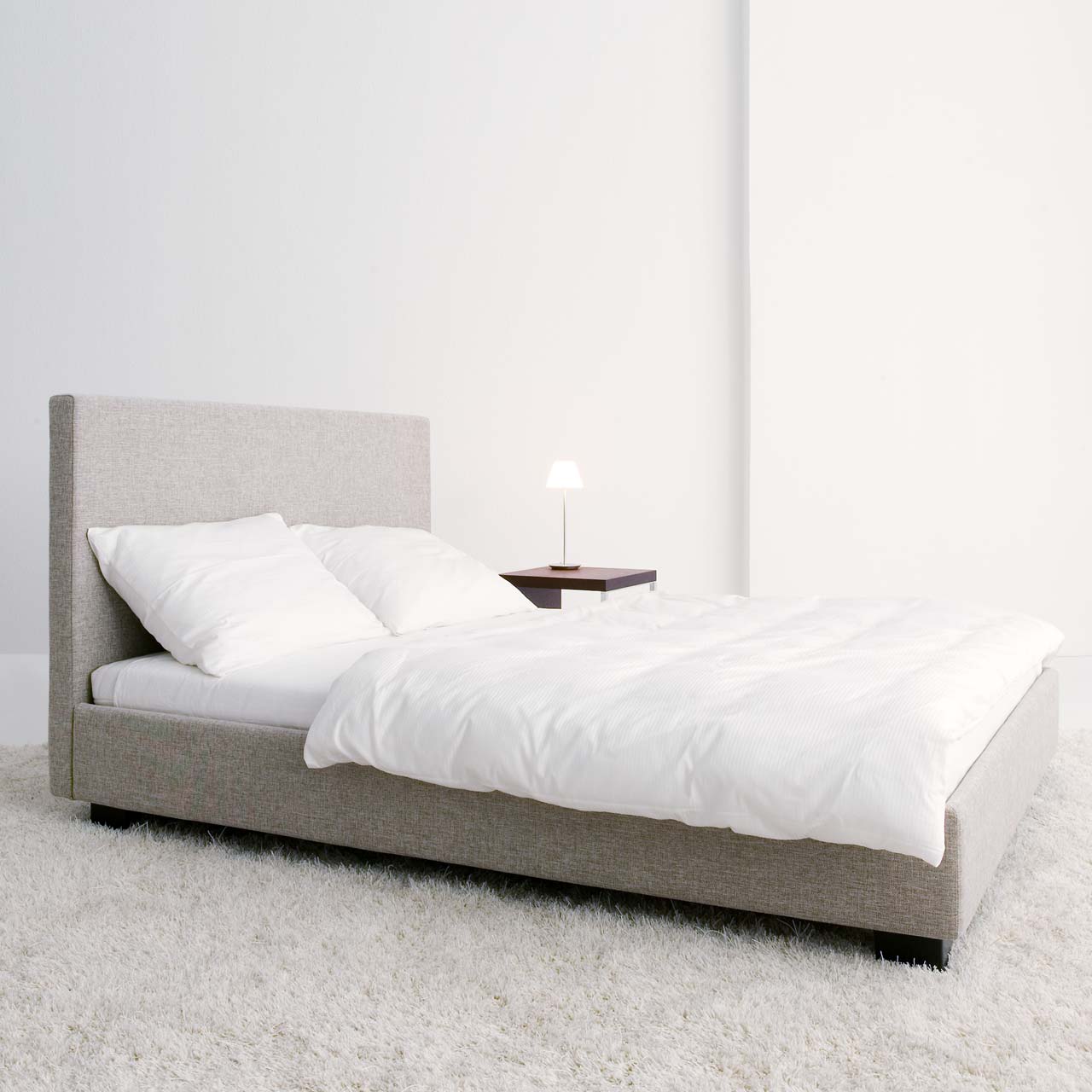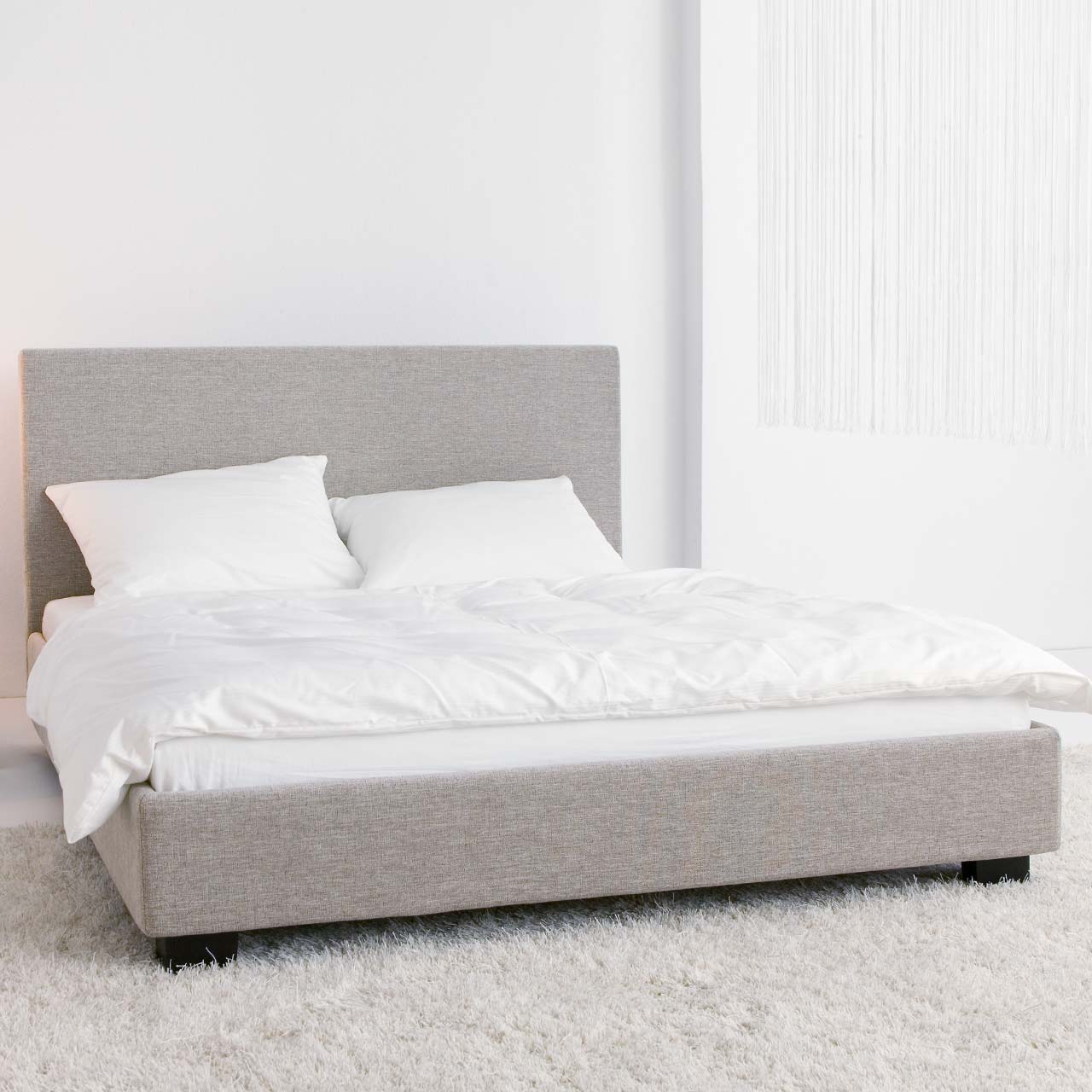 Das Preisbeispiel bezieht sich auf eine Kombination aus stoffbezogenem Rahmen und schlichtem stoffbezogenem Kopfteil extrahoch und Winkelfüße aus Buchenholz wengefarben gebeizt. Der Lattenrost und die Matratzen sind nicht enthalten.