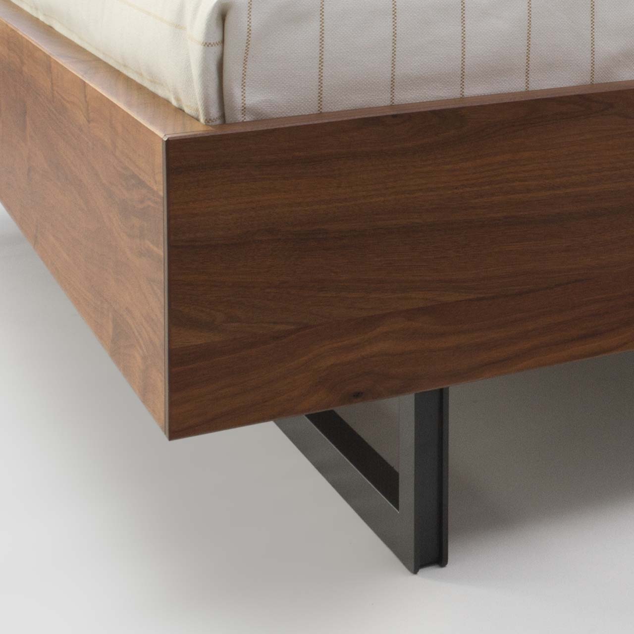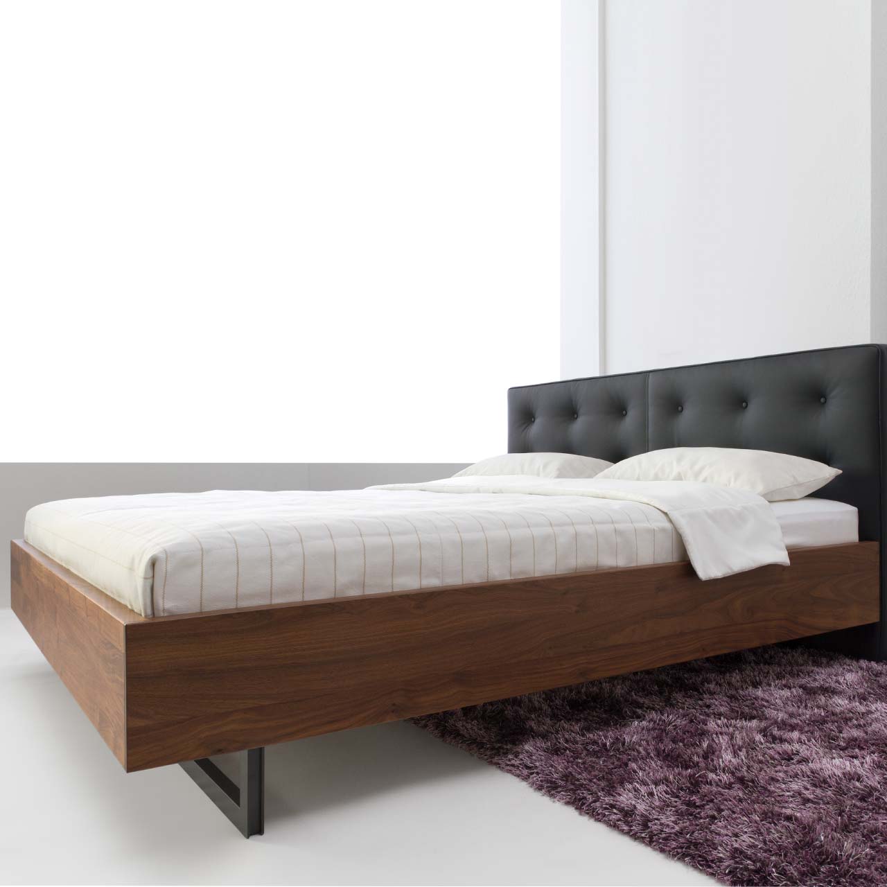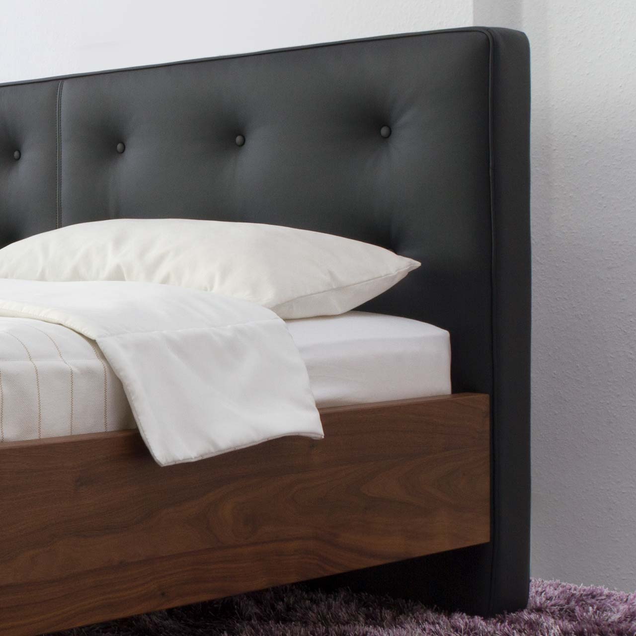 Das Preisbeispiel bezieht sich auf eine Kombination aus Nussbaum massiv, dem geknöpften Kopfteil extrastark und Profil-Kufen in schwarz eloxiert. Der Lattenrost und die Matratzen sind nicht im Preis inkludiert.