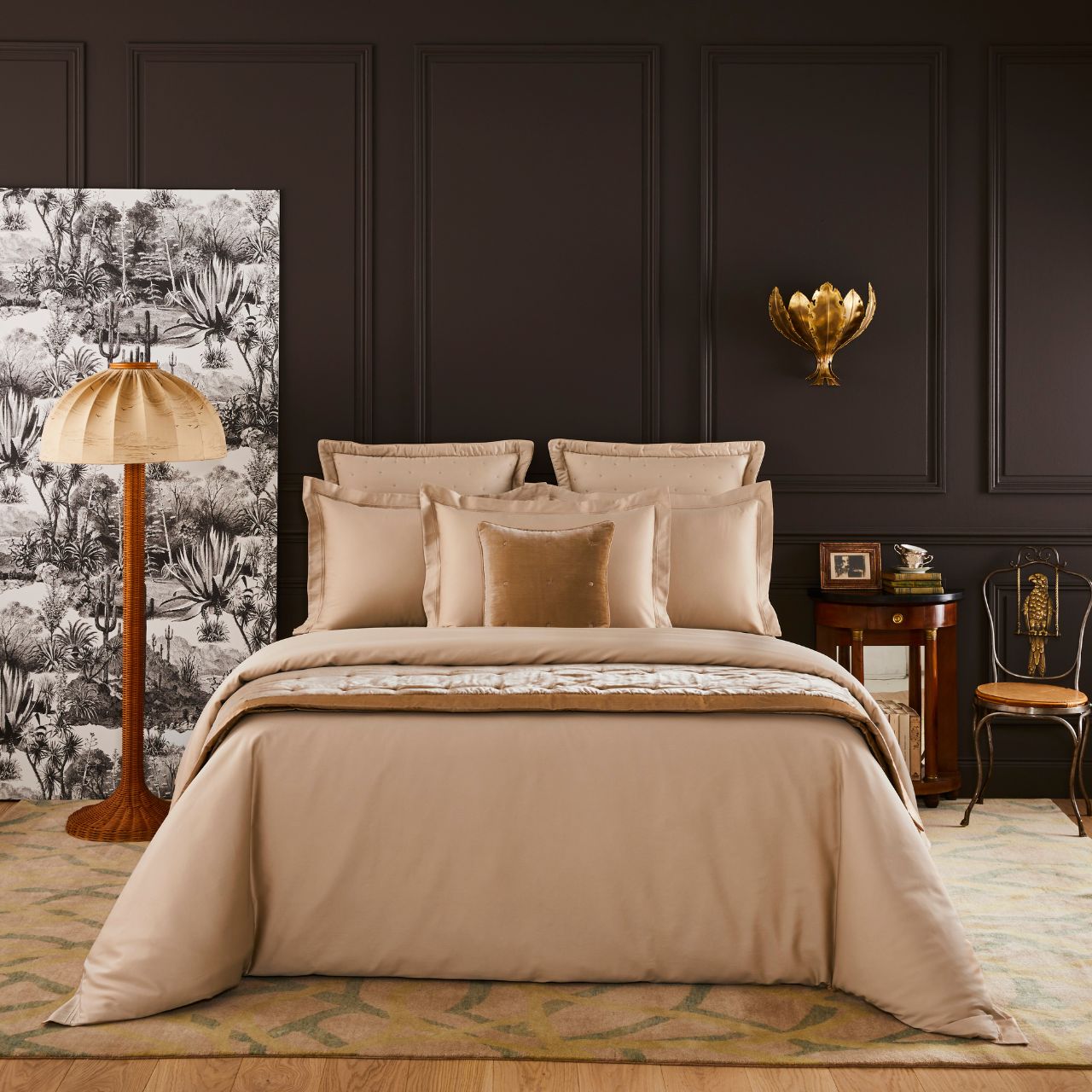 Die Bettwäsche „Triomphe“ begeistert mit einem schlichten, unifarbenen Design, das durch eine edle Ton-in-Ton-Kordel akzentuiert wird. Der luxuriöse Baumwollsatin mit 120 Fäden pro cm² sorgt für einen sanften Glanz und eine geschmeidige Haptik – ideal für Liebhaber stilvoller Schlichtheit.